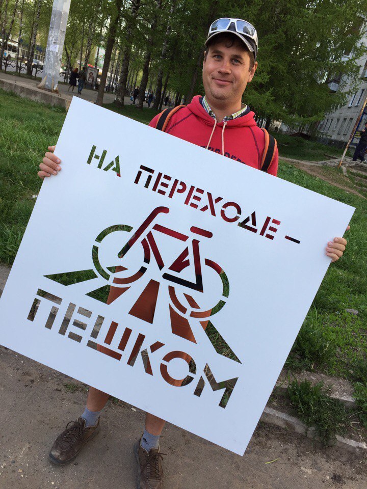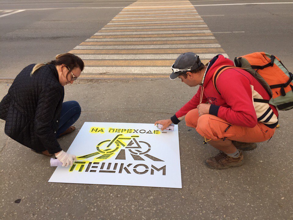 Активисты сделали на дорогах граффити, которые призывали спешиться с велосипедов во время движения по пешеходному переходу.