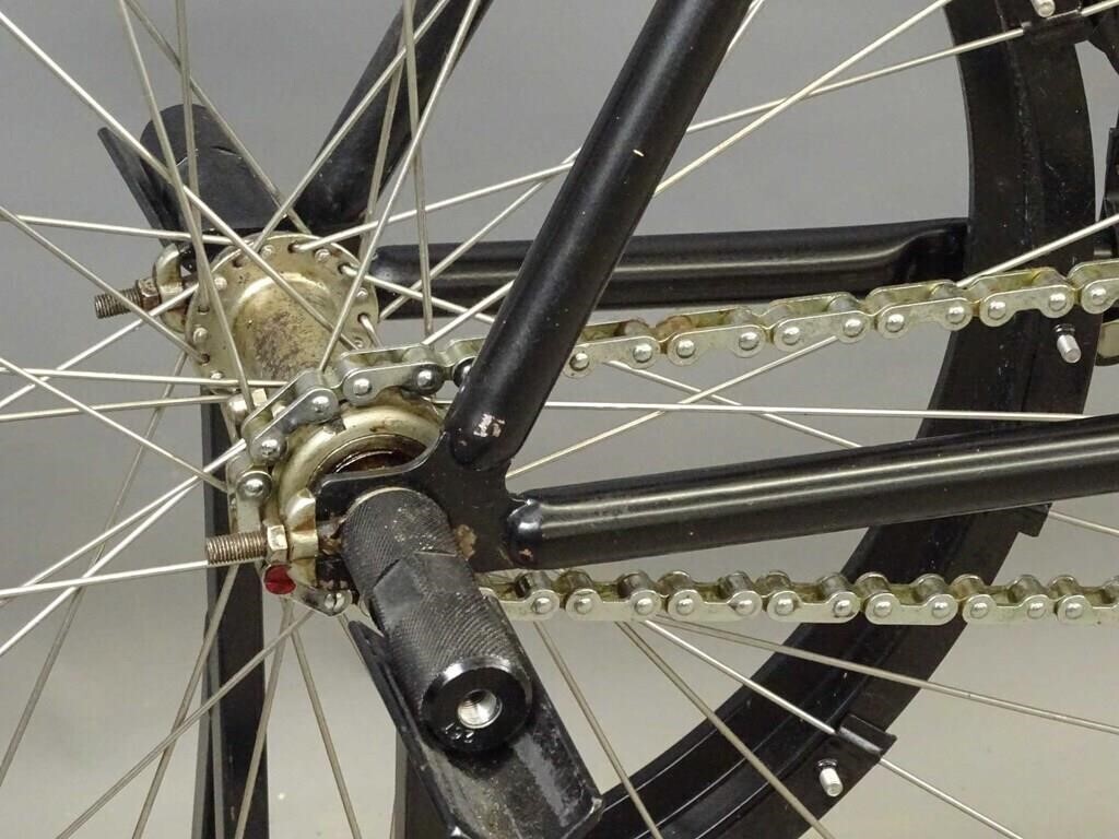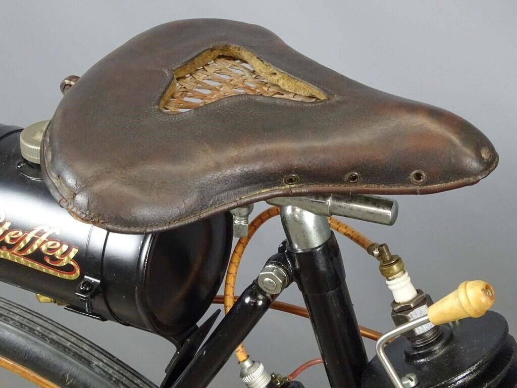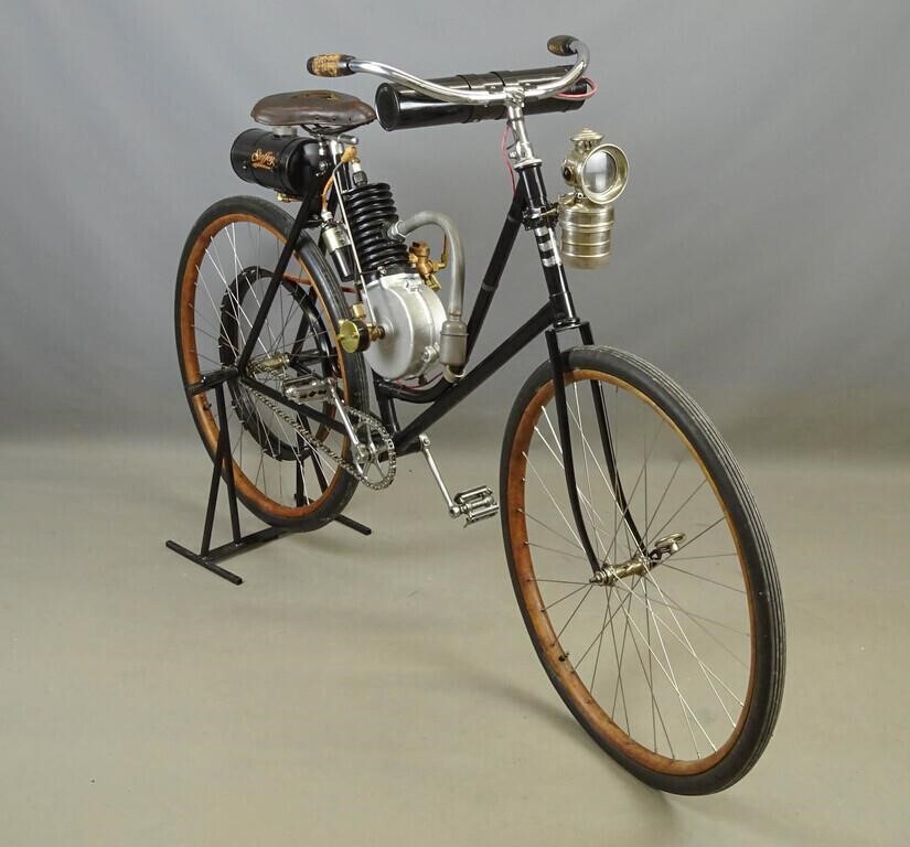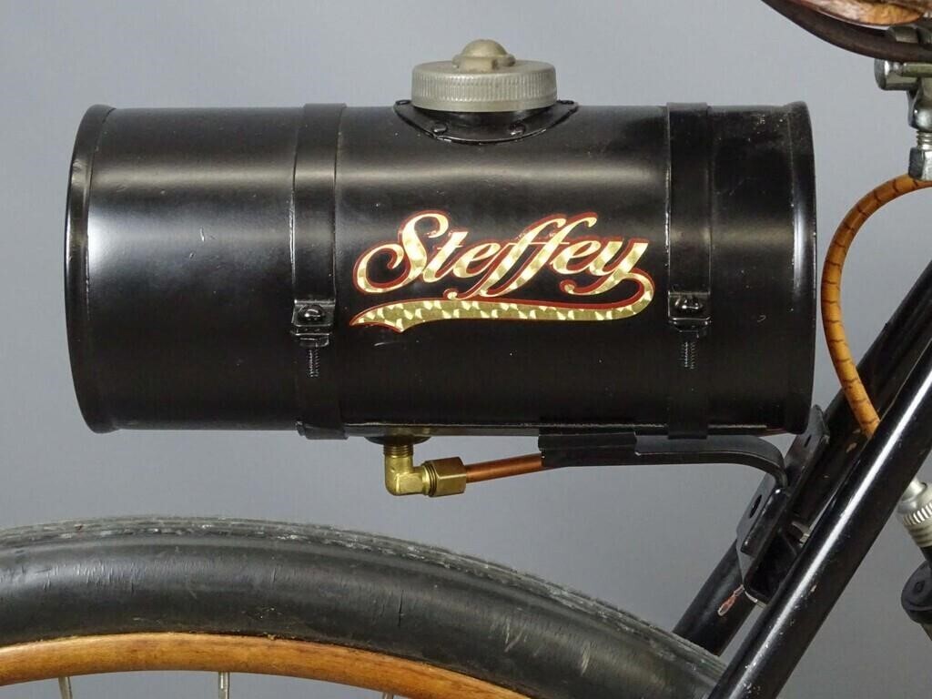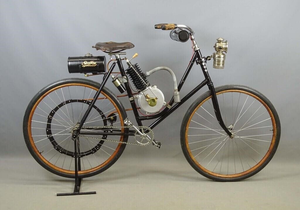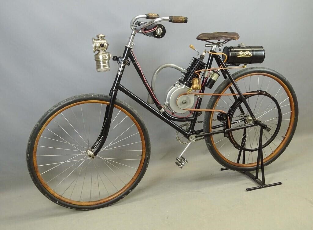 Компания Steffey Manufacturing Co. в Филадельфии производила двигатели и велосипедные комплектующие в начале двадцатого века. Двигатели крепились к велосипедам разной марки. К примеру, к таким, как этот потрясающий экземпляр 1902 года. Велосипед с двигателем был продан 21 октября 2023 года за (30 000 долларов 2.617.000 рублей).