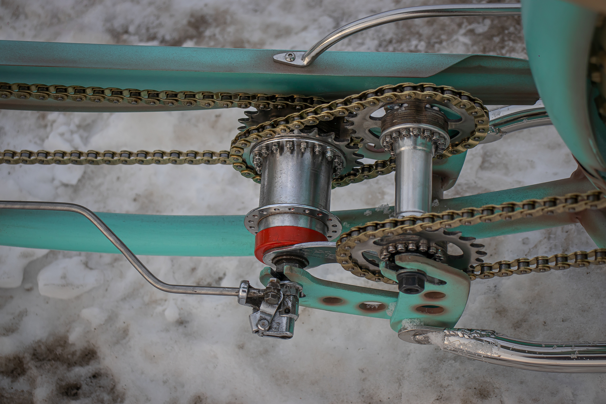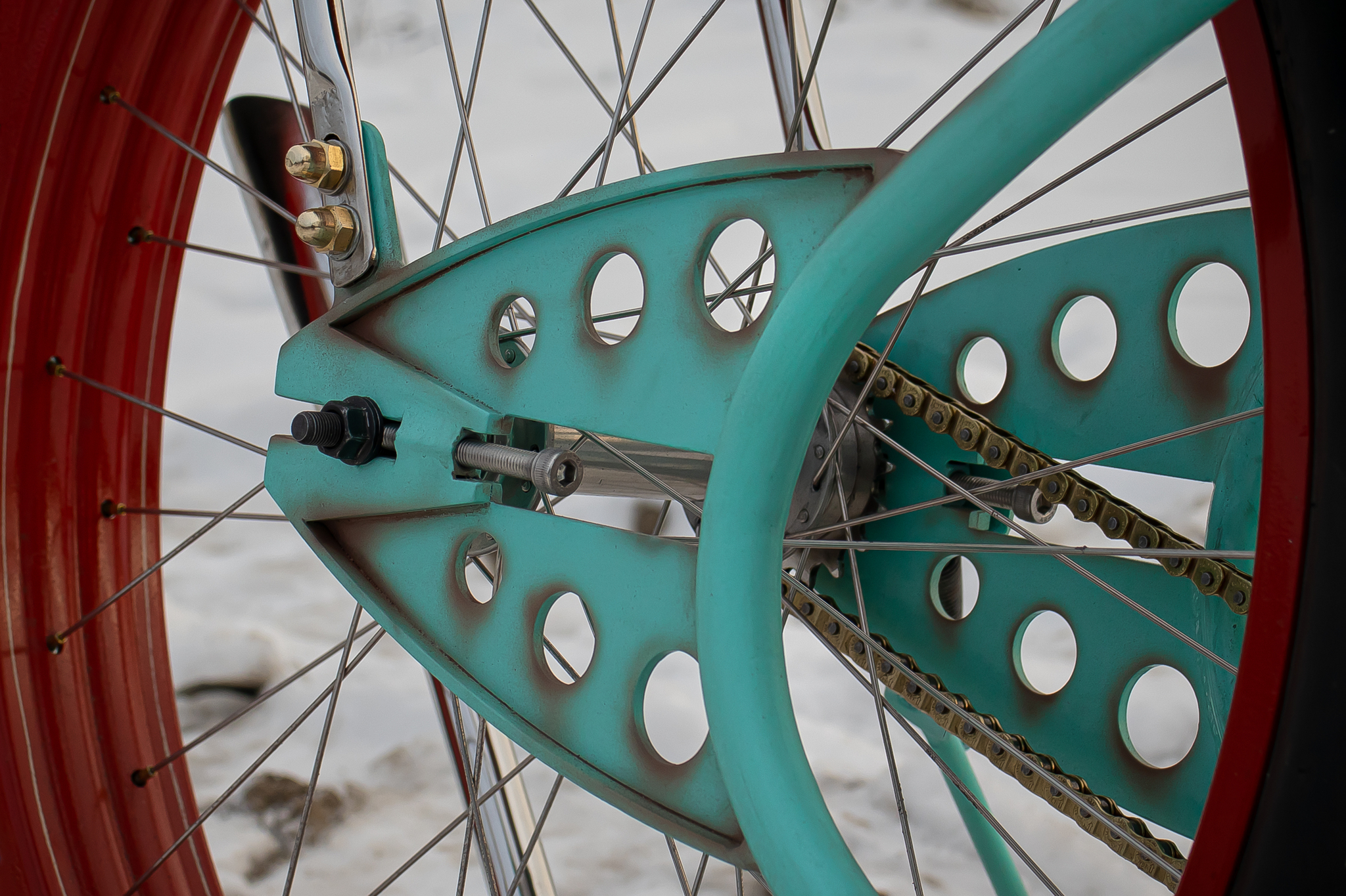 Классический приём - как "обойти" широкое колесо цепью. Часто встречается на зарубежных чоппер-байках. Также это позволят установить практически любую втулку, в том числе и планетарную. Переключение скорости осуществляется за счёт движения стальной тяги.