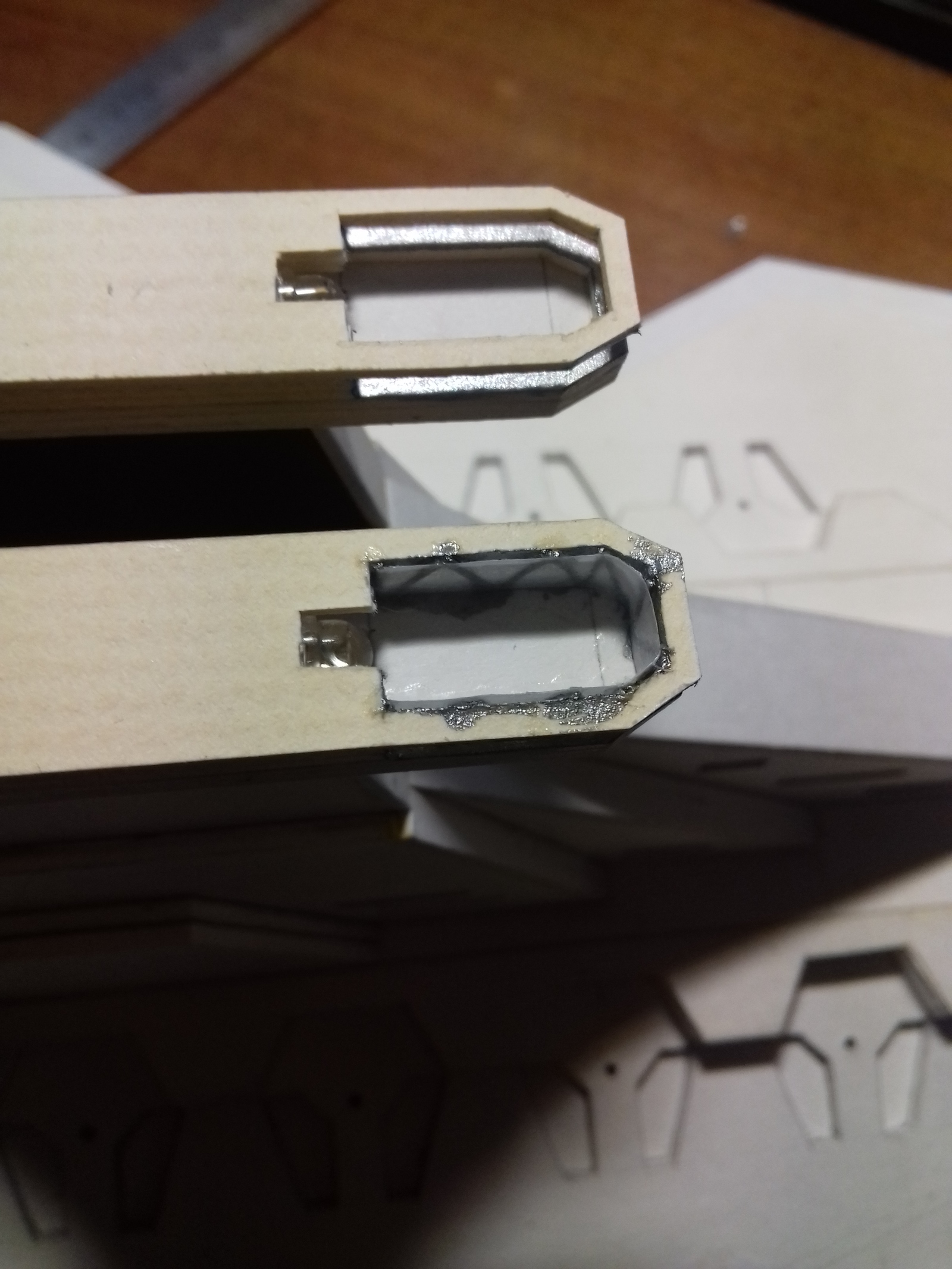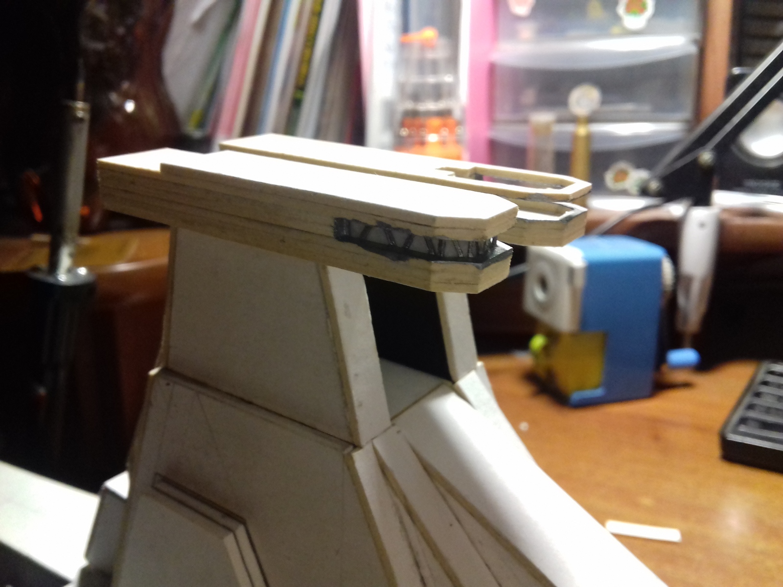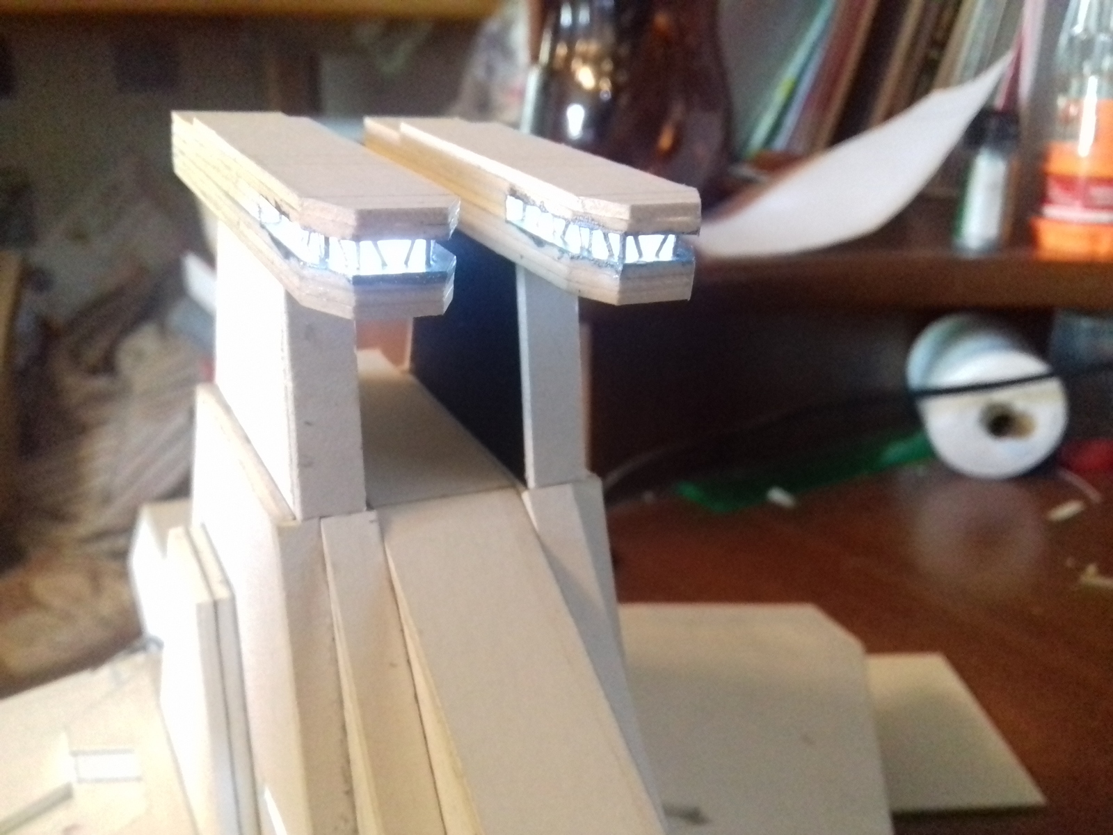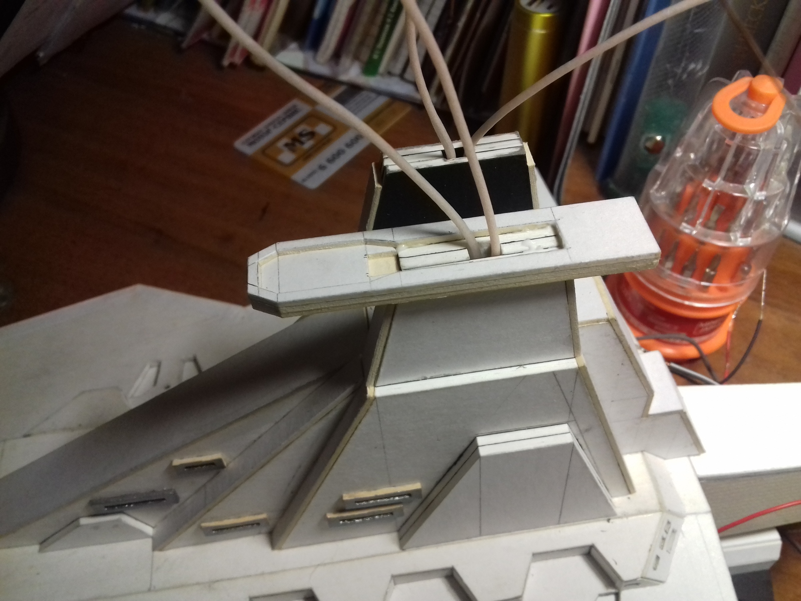 Как и башня мостиков, их сделал путем послойного набора из картона,а не выклеиванием каждой стенки. Причина - сложно сделать прочно из-за мелких размеров и расслоения картона при этих же мелких размерах срезов.