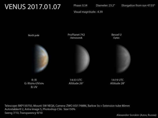 Я давно мечтал отснять Венеру в таком виде в каком она представлена здесь. Правое изображение получено в ультрафиолетовом диапазоне, центральное в инфракрасном. Слева представлен цветной композит в котором зеленый канал был синтезирован путем смешения в равных пропорциях ИК и УФ. Таким образом можно наблюдать облачность на этой самой яркой планете. Следующий шаг – попытаться заснять движение облаков по диску Венеры.