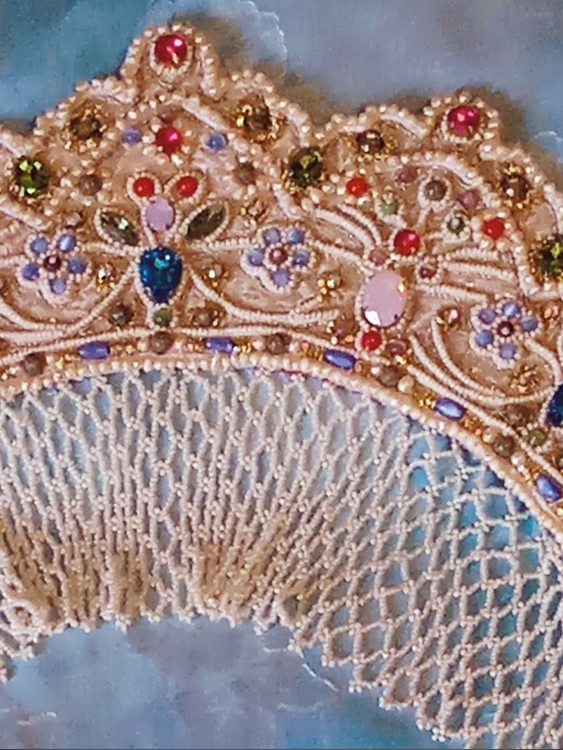 Народные головные уборы - интереснейшая часть собрания ГОСУДАРСТВЕННОГО ОРДЕНА ЛЕНИНА ИСТОРИЧЕСКОГО МУЗЕЯ(где и хранится венец, которое я взяла за основу своей работы). Многие из них датируются XVIII веком. Разнообразны формы и украшения головных уборов; в каждой местности их шили по-своему, но везде различали девичий и женский. Это определялось древним обычаем. Общим для всех восточнославянских народов был обычай, по которому замужняя женщина должна была прятать свои волосы от постороннего глаза, нельзя было непокрытой выходить из дома, заниматься домашними делами. Девушки заплетали волосы в одну косу и могли не покрывать их. Отсюда обусловленность формы головного убора: для замужней женщины - закрытая шапочка, для девушки - легкая повязка, обруч, оставляющий верх головы открытым.Подобные венцы «с городками» были распространены на севере Европейской России: в Архангельской, Вологодской, Олонецкой, Новгородской губерниях, на севере Костромской, северо-западе Тверской, в некоторых деревнях Санкт-Петербургской и Пермской губернии. Венец рассматривался в русской деревне не только как предмет утилитарного назначения, но и как знак принадлежности человека к определенной половозрастной группе, т. е. группе девушек брачного возраста.