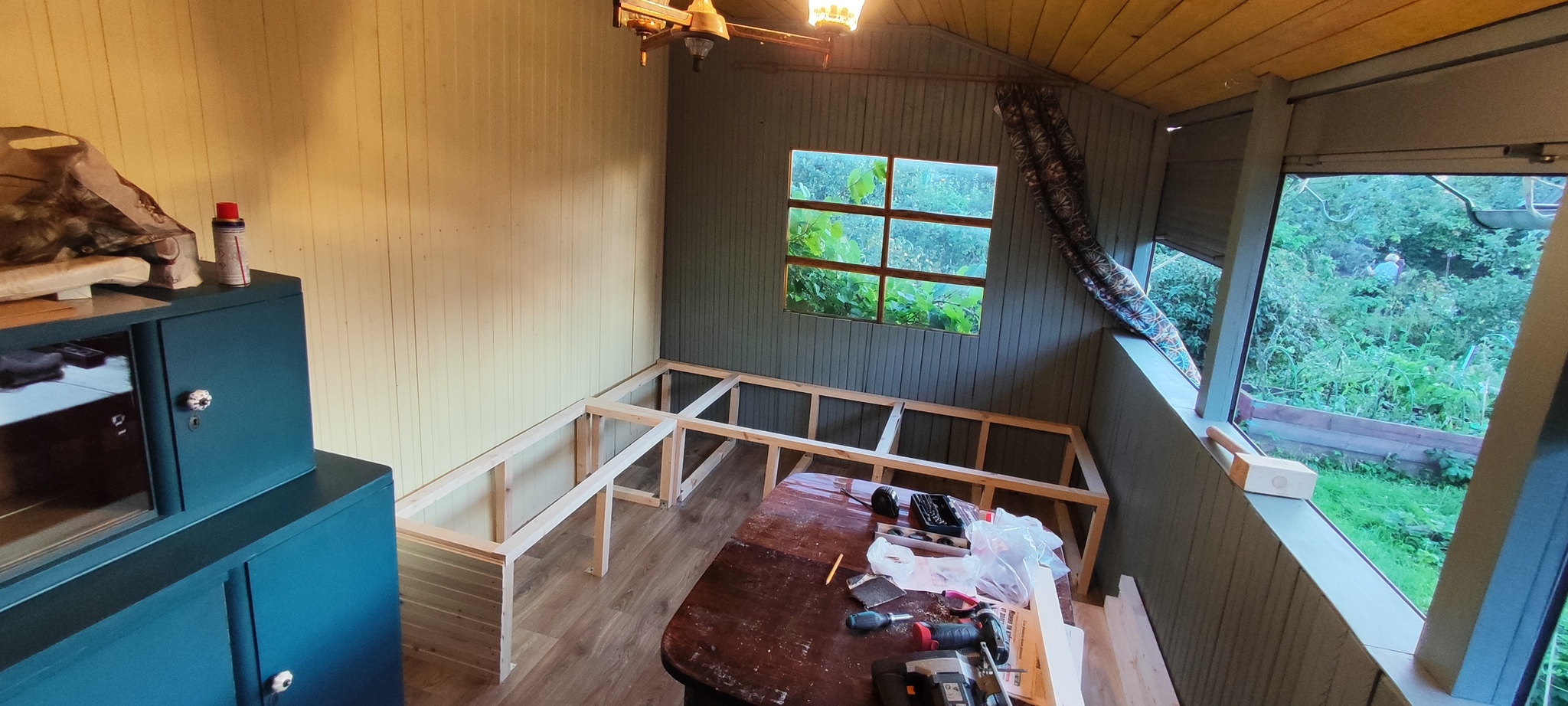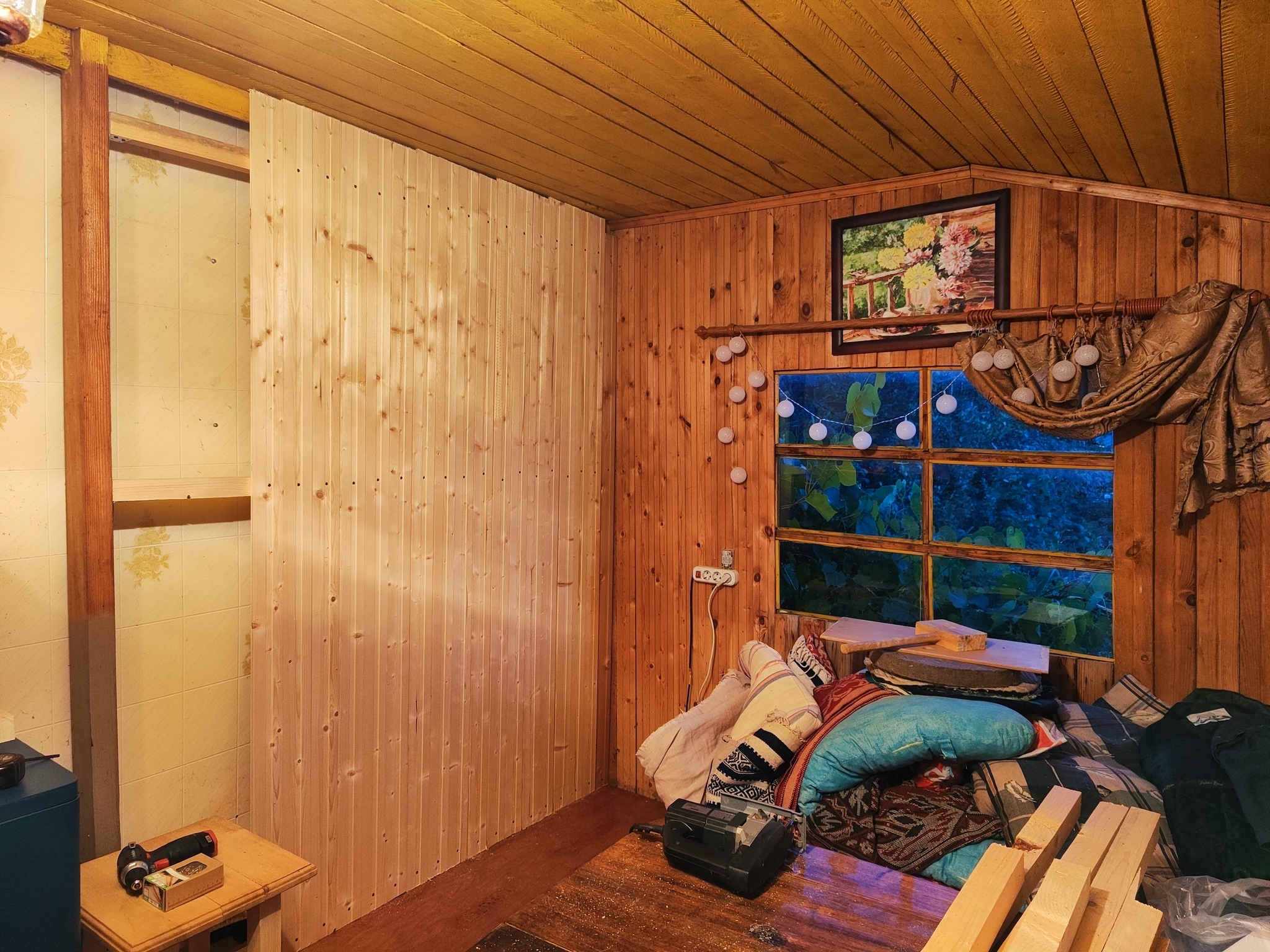 Пол накинула из больших фанерных листов, да начала обшивкой заниматься.