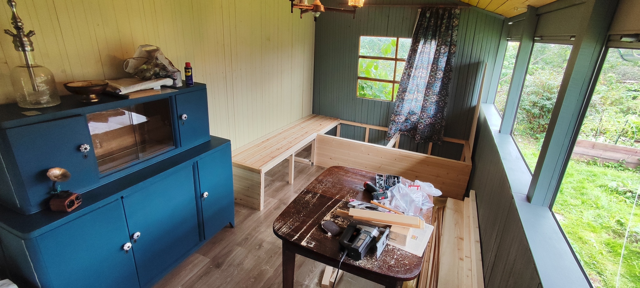 Долго я рассчитывала сколько и чего мне нужно. Чертежник из меня хреновый, но брус был посчитан. Идея такая: слева лавка для "посидеть", справа полежать на лавке-сундук. Туда удобно на зиму всякие шланги и прочее убирать.