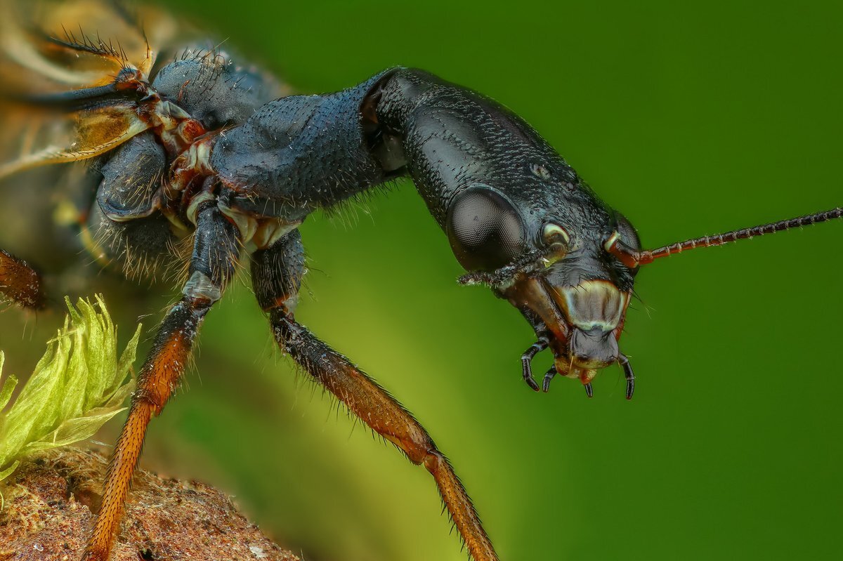 На голове располагаются большие и хорошо развитые фасеточные глаза, расположенные по бокам. Также пишут, что есть 3 простых глазка, но не у всех видов. Между глазами на голове имеются нитевидные усики. Ротовой аппарат грызущего типа, которому позавидует даже хищник из одноименного фильма (нет, правда, среди всего, что есть у насекомых, меня всегда в дрожь бросает от того, что у них вместо рта).