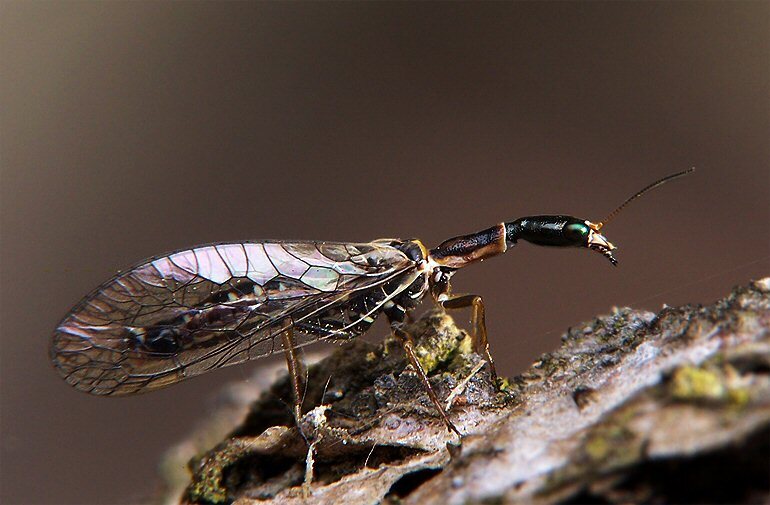 Переходим к питанию, и, как я уже говорил, наши знакомые - активные хищники. Взрослые Верблюдки охотятся на тлей, щитовок, личинок мух и пилильщиков, гусениц бабочек, паутинных клещей и еще целую кучу других насекомых, которые будут им по зубам (по челюстям...по жвалам...в общем, вы поняли). Также они могут есть пыльцу растений, чтобы немного разнообразить свой рацион, но это когда нет возможности закусить чем-то более мясным. Обычно взрослые особи медленно ползают по коре деревьев, ощупывая всё перед собой постоянно вибрирующими усиками, а когда находят кого-то похожего на обед, тут же вгрызаются в него своими жвалами и начинают страшно рвать на куски и есть.