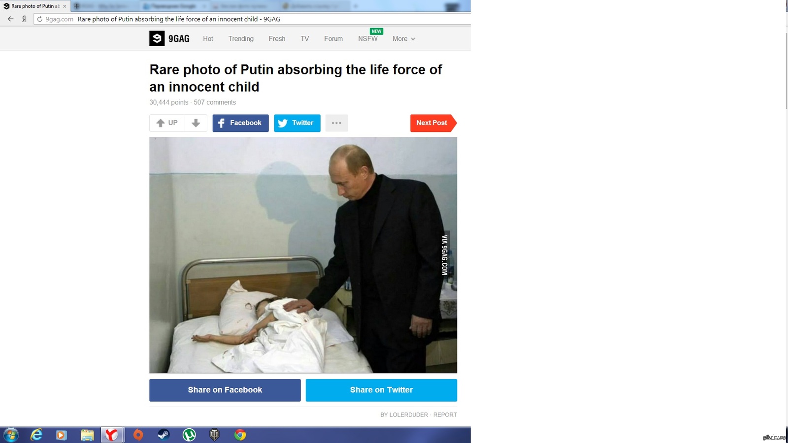 KAPTOIIIKAHABEKA ВЕРХ Цинизма!!! 11 лет назад Просматривал я 9гаг. перевод(Редкое фото Путина поглощающего жизненную силу невинного ребенка) фото с событий в Беслане. У нас трагедия, а им шутки шутить. Беслан Владимир Путин Мрази 9GAG