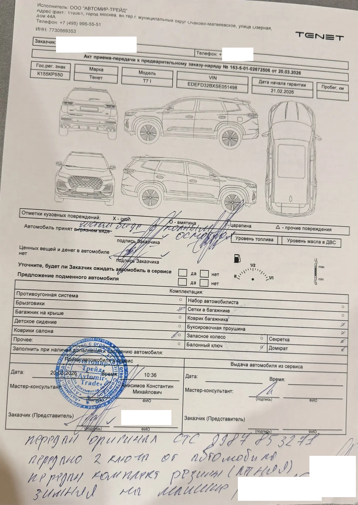 И еще одна история про ТЕНЕТ Т7, который тянет в сторону. До этого была целая серия историй, в которой Автомир на Озерной говорил, что если машину тянет в сторону то: надо держать руки на руле; нигде не написано, что машина должна ехать прямо; это уклон дороги и боковой ветер и т.д. Главное - не признавал проблему, что увод автомобиля в сторону это недостаток. В прошлой истории мы ушли в суд и ее окончание будет еще не скоро (было 2 проверки качества и 3 дня экспертизы). И когда мы были в последний раз на экспертизе автомобиля Анастасии, к нам подошел человек по имени Александр и спросил, а у нас тоже автомобиль в сторону тянет? Он купил машину 3 дня назад жене. Сегодня он уже 4 часа сидит в салоне. Пытаются решить проблему с уводом в сторону, но она не хочет решаться. Дал ему свой номер телефона и забыл.