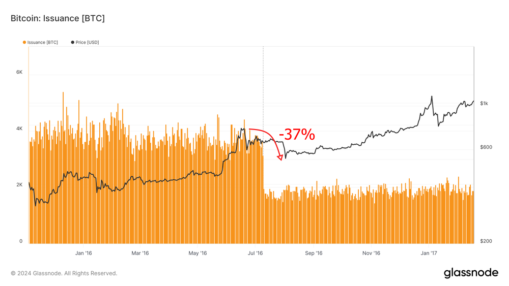 В одном случае из трех, после халвинга 2016 года, Bitcoin скорректировался более чем на 30%. Значимых факторов для крупной распродажи не было, коррекция стала реализацией поговорки «покупай слухи, продавай факты». С начала 2016 года цена выросла на 75%, а после халвинга от локального максимума она за два месяца упала на 37% до $470.