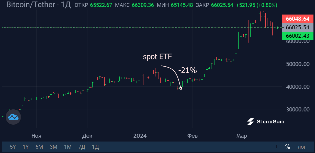 В этом году цена выросла на 74%, что аналогичным образом побуждает ряд игроков зафиксировать прибыль. В последний раз принцип «покупай слухи, продавай факты» был реализован на одобрении спотовых ETF: цена скорректировалась на 21% до $38,5 тыс.