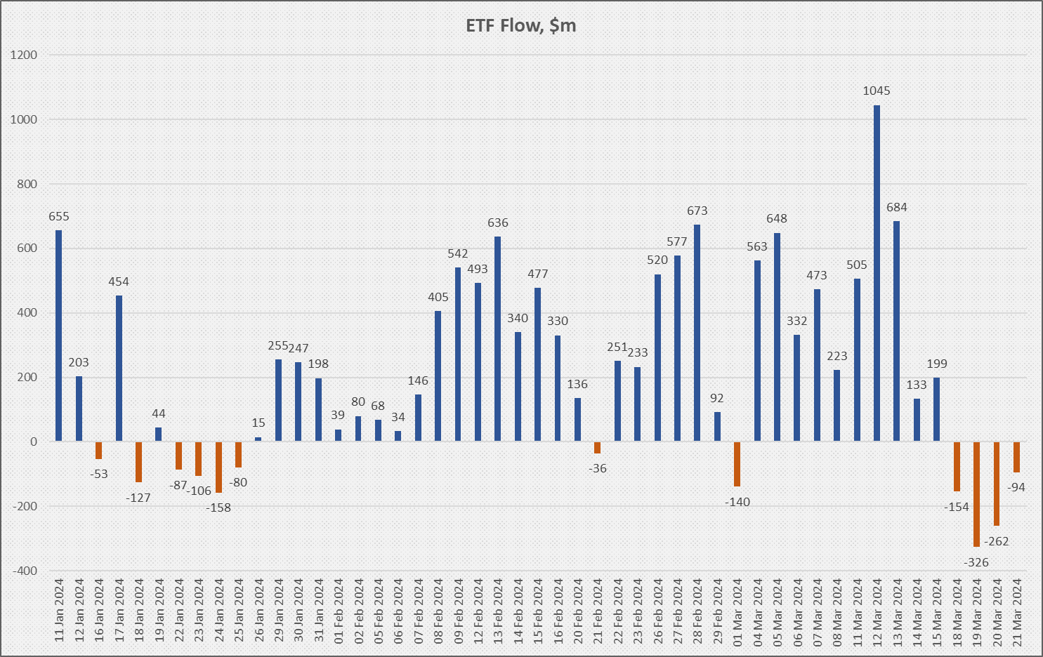 Отличие же данного четвертого халвинга от предыдущих заключается как в преждевременном достижении исторического максимума, так и в появлении «Bitcoin-пылесоса» в лице ETF. Халвинг представляет собой окончательное сокращение поступающего предложения, а вот инвесторы ETF точно так же, как и прочие участники рынка, подвержены эмоциям.