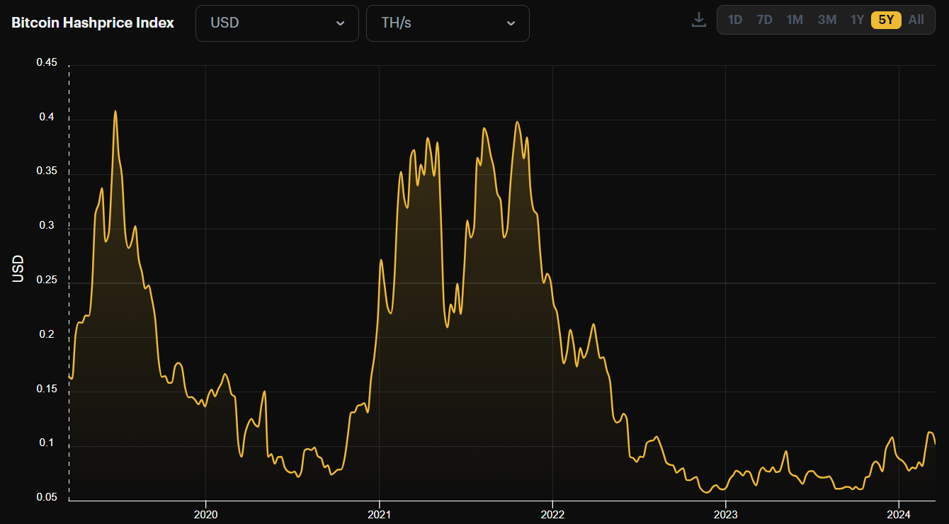 В этот раз конкурентная борьба среди майнеров находится на беспрецедентно жестком уровне, где почти треть хешрейта сети обеспечивают публичные майнинг-компании. Чтобы оценить всю серьезность ситуации, достаточно взглянуть на доходность с терахеша мощности, которая все сильнее отстает от цены.