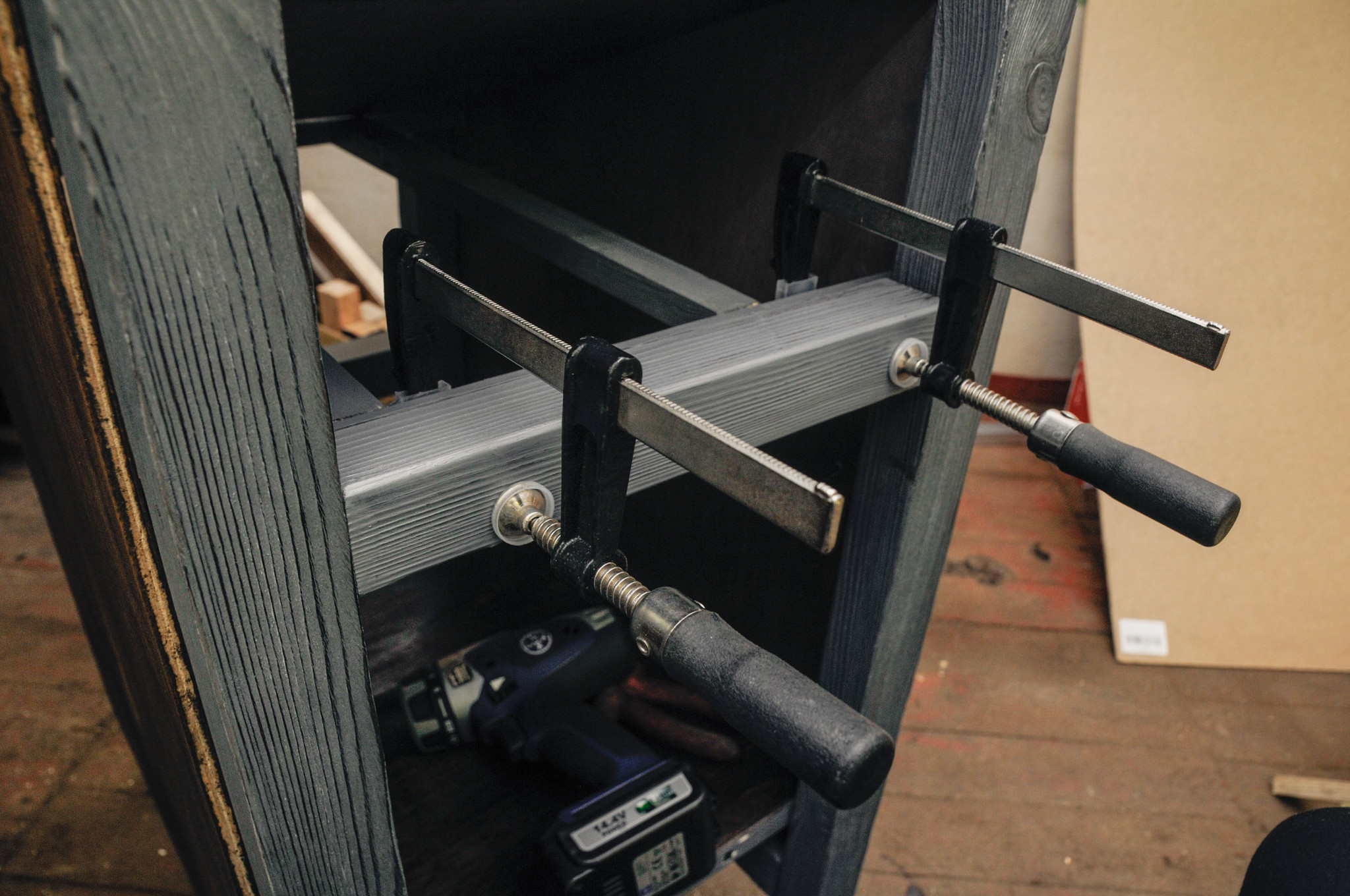 Фасады ящиков я сделала точно также - обожгла, отбрашировала, покрасила. Посадила их на тушки ящиков саморезами прям с лица. Направляющие - из деревянной рейки, потому что это сильно дешевле, чем металлические. Вместо ручек оставила зазоры между ящиками, что оказалось крайне непрактичным решением.