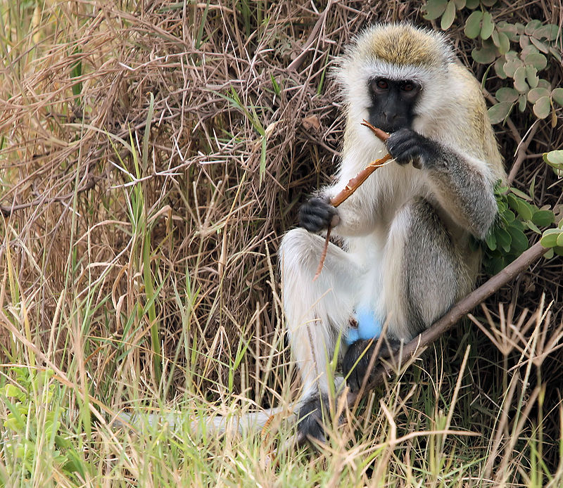 Самец верветки в парке Лейк-Маньяра, Танзания, демонстрирует голубую мошонку