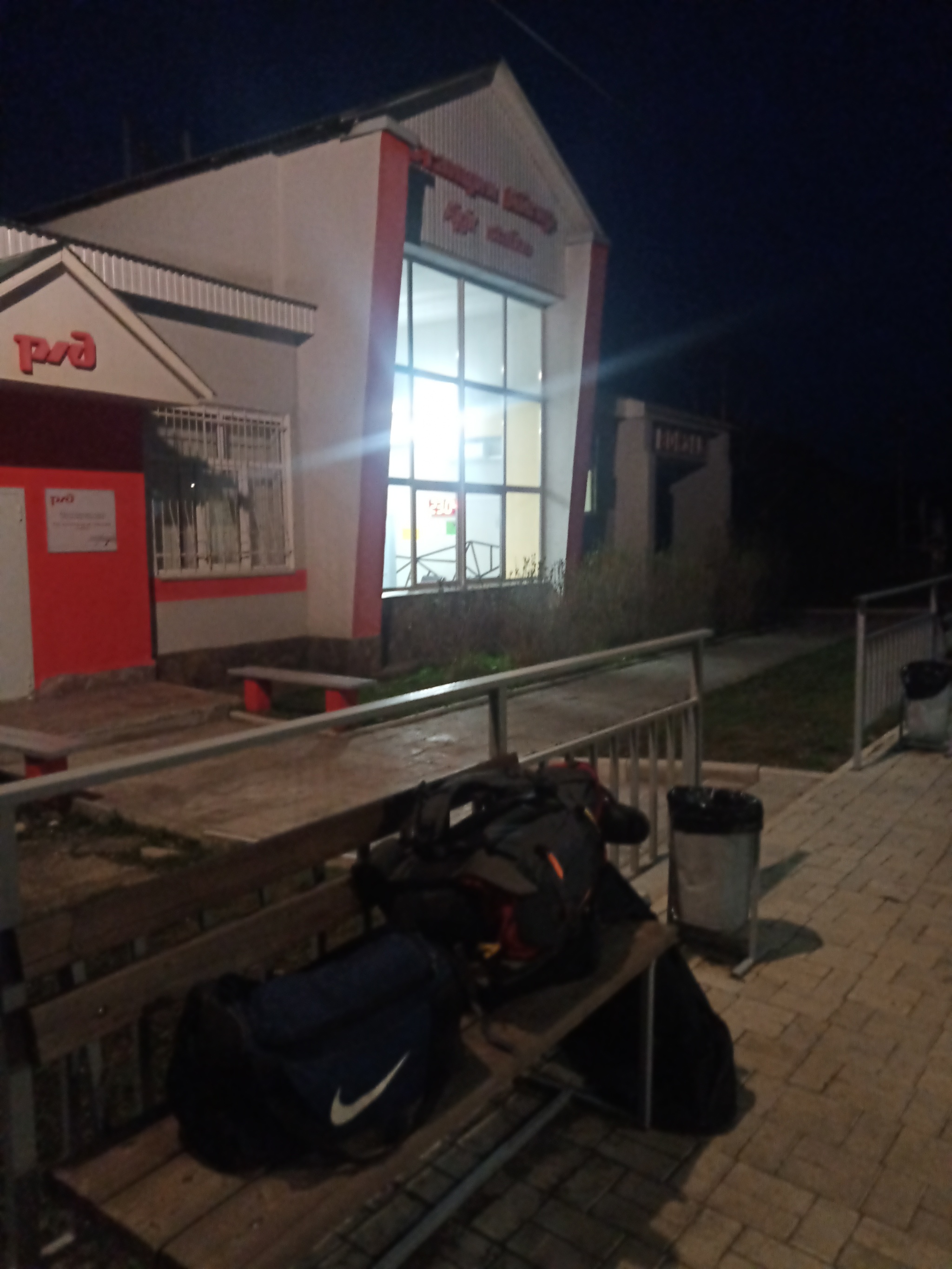 Приехал на вечерней электричке из Уфы, уже стемнело но станция еще открыта можно зарядить телефон попить кофе в автомате. Подыматся в ночь не стал заночевал у реки.