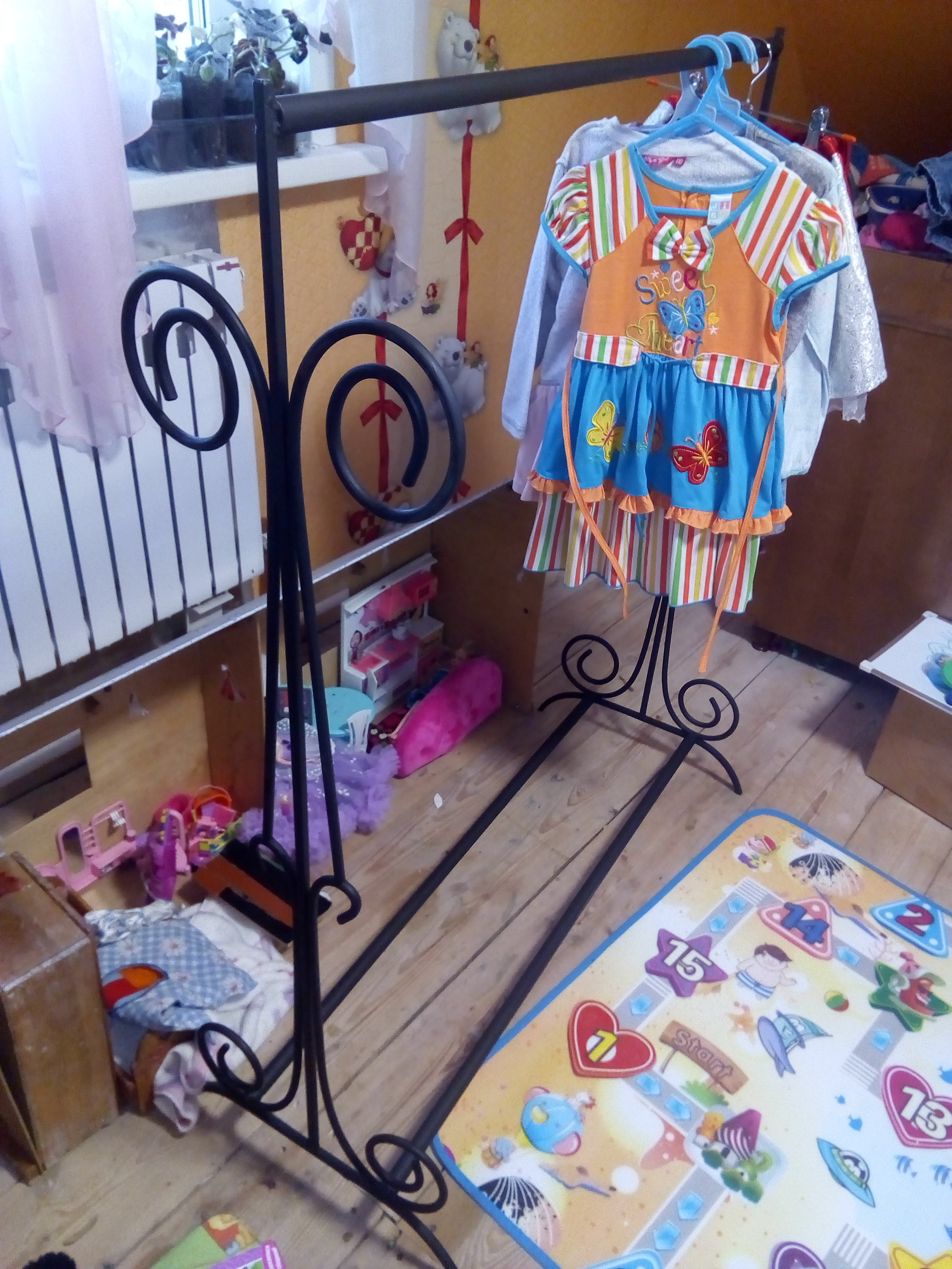 Началось все с того, что жена сказала - ребёнку надо вешалку для одежды. В магазине высота вешалки 170 см плюс минус немножко. В детской комнате на втором этаже есть "крылья" с наклонной стенкой, где планируется поставить вешалку. Высота вешалки должна быть примерно 120-130.
