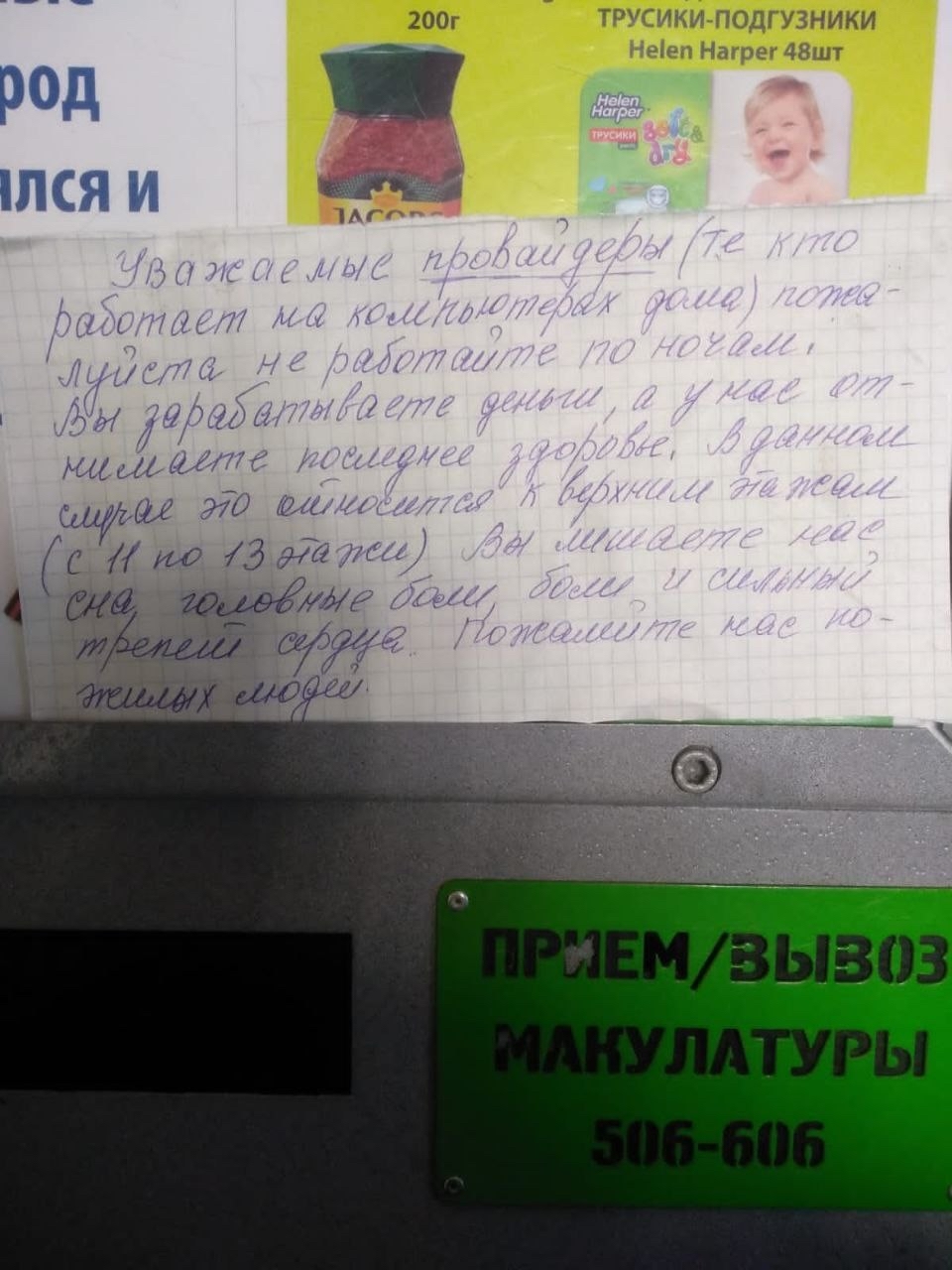 Уважаемые провайдеры (те кто работает на компьютерах дома) пожалуйста не работайте по ночам. Вы зарабатываете деньги, а у нас отнимете последнее здоровье. В данном случае это относится к верхним этажам (с 11 по 13 этажи) Вы лишаете нас сна, головные боли, боли и СИЛЬНЫЙ ТРЕПЕТ СЕРДЦА. Пожалейте нас пожилых людей.