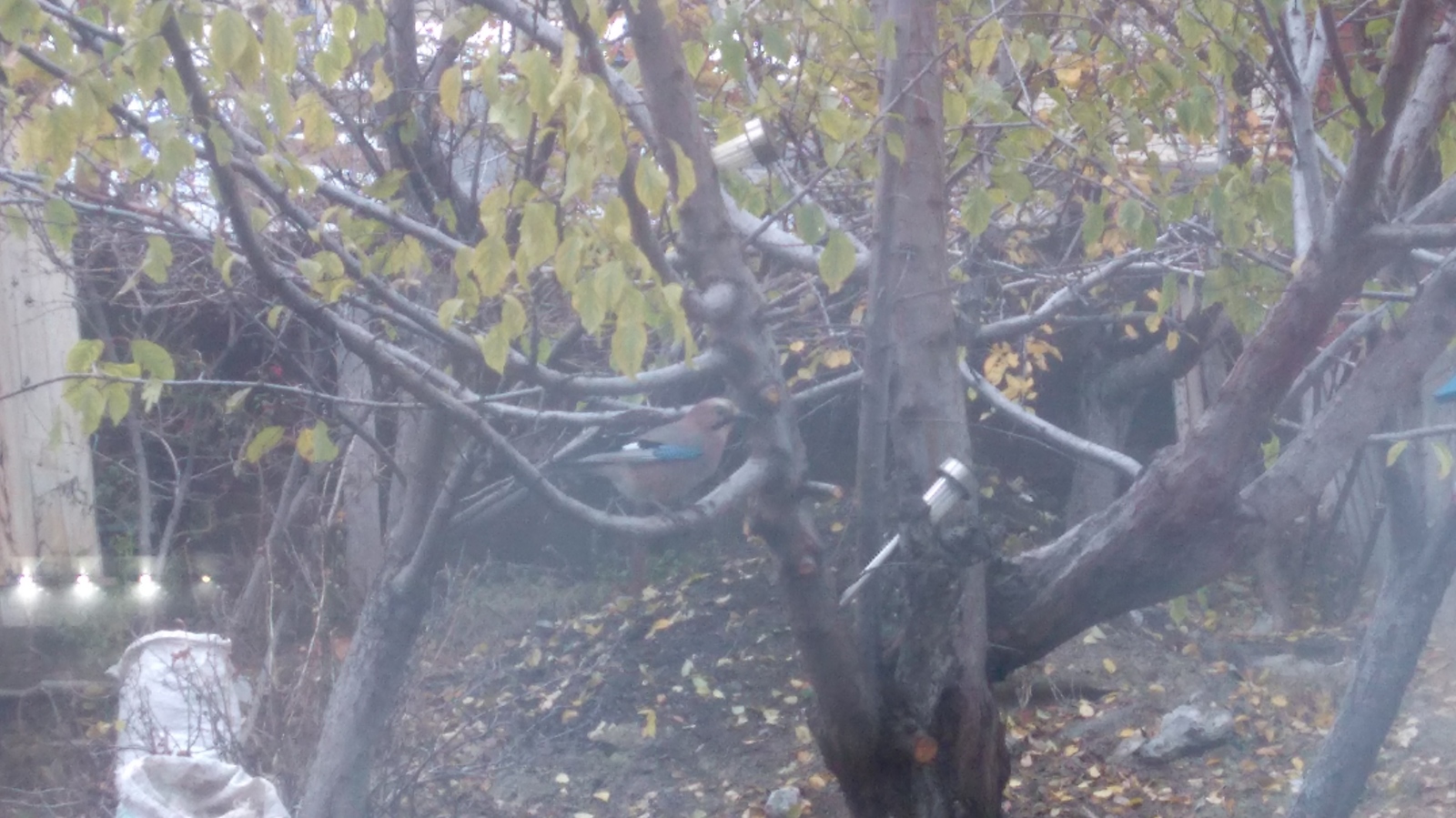 А это сойка. Не свиристель! Тоже прилетела поклевать сало, но она и хлеб ест с удовольствием.
