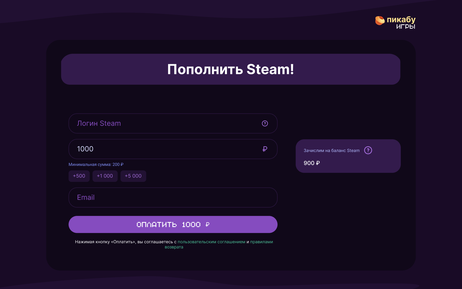 Ныряем в интуитивно понятный интерфейс: указываем логин Steam, сумму пополнения, электронный адрес для получения квитанции.