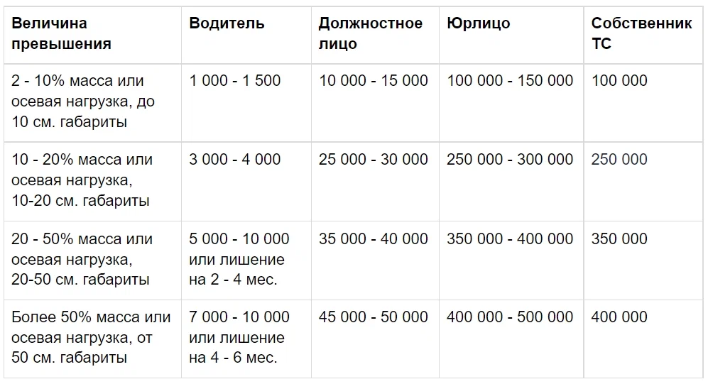 Сейчас КоАП предусматривает штрафы для перевозчиков до 400 тысяч рублей — в зависимости степени превышения допустимой массы или габаритов.