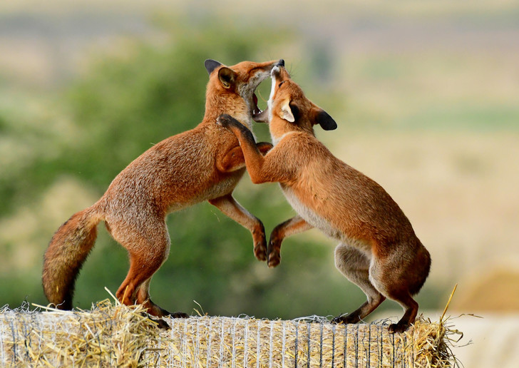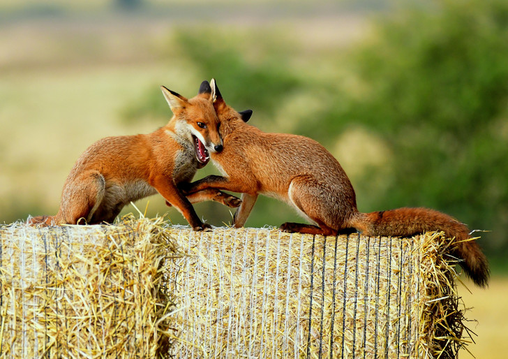 Шотландия, графство Айршир. Фотограф Джордж Финдлей стал свидетелем игры двух лисят, которые устроили потешную драку на тюке соломы в окрестностях деревни Тарболтон.