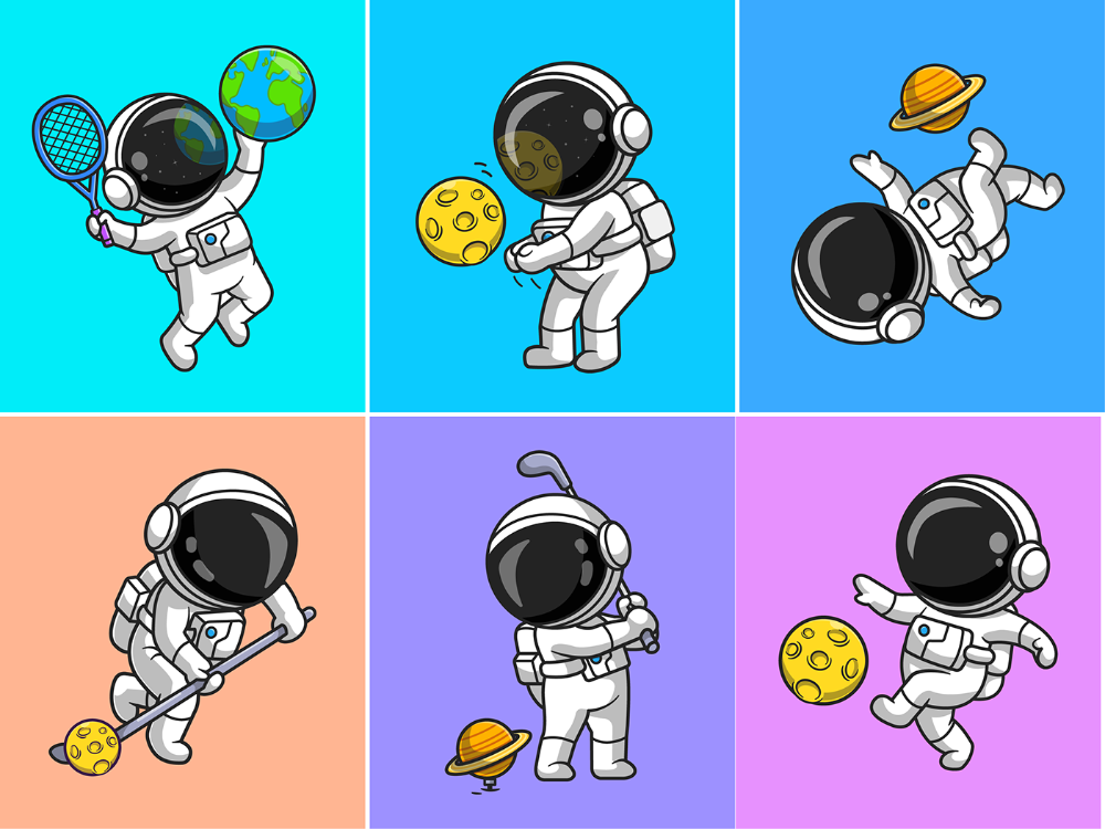 - На голове у космонавтов шлем (наклоны и повороты головы).