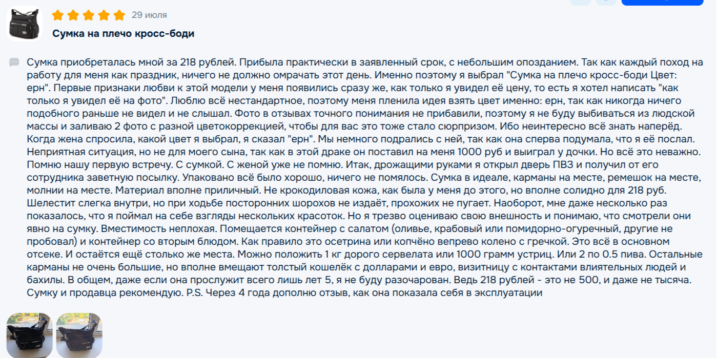Сумка приобреталась мной за 218 рублей. Прибыла практически в заявленный срок, с небольшим опозданием. Так как каждый поход на работу для меня как праздник, ничего не должно омрачать этот день. Именно поэтому я выбрал "Сумка на плечо кросс-боди Цвет: ерн". Первые признаки любви к этой модели у меня появились сразу же, как только я увидел её цену, то есть я хотел написать "как только я увидел её на фото". Люблю всё нестандартное, поэтому меня пленила идея взять цвет именно: ерн, так как никогда ничего подобного раньше не видел и не слышал. Фото в отзывах точного понимания не прибавили, поэтому я не буду выбиваться из людской массы и заливаю 2 фото с разной цветокоррекцией, чтобы для вас это тоже стало сюрпризом. Ибо неинтересно всё знать наперёд. Когда жена спросила, какой цвет я выбрал, я сказал "ерн". Мы немного подрались с ней, так как она сперва подумала, что я её послал. Неприятная ситуация, но не для моего сына, так как в этой драке он поставил на меня 1000 руб и выиграл у дочки. Но всё это неважно. Помню нашу первую встречу. С сумкой. С женой уже не помню. Итак, дрожащими руками я открыл дверь ПВЗ и получил от его сотрудника заветную посылку. Упаковано всё было хорошо, ничего не помялось. Сумка в идеале, карманы на месте, ремешок на месте, молнии на месте. Материал вполне приличный. Не крокодиловая кожа, как была у меня до этого, но вполне солидно для 218 руб. Шелестит слегка внутри, но при ходьбе посторонних шорохов не издаёт, прохожих не пугает. Наоборот, мне даже несколько раз показалось, что я поймал на себе взгляды нескольких красоток. Но я трезво оцениваю свою внешность и понимаю, что смотрели они явно на сумку. Вместимость неплохая. Помещается контейнер с салатом (оливье, крабовый или помидорно-огуречный, другие не пробовал) и контейнер со вторым блюдом. Как правило это осетрина или копчёно вепрево колено с гречкой. Это всё в основном отсеке. И остаётся ещё столько же места. Можно положить 1 кг дорого сервелата или 1000 грамм устриц. Или 2 по 0.5 пива. Остальные карманы не очень большие, но вполне вмещают толстый кошелёк с долларами и евро, визитницу с контактами влиятельных людей и бахилы. В общем, даже если она прослужит всего лишь лет 5, я не буду разочарован. Ведь 218 рублей - это не 500, и даже не тысяча. Сумку и продавца рекомендую. P.S. Через 4 года дополню отзыв, как она показала себя в эксплуатации