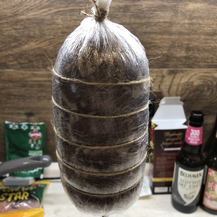 Фарш выложил на пищевую пленку и обернул в несколько слоёв, сделав хвостики катал по столу и поджимал батончик, зубочисткой пробил множество дырок, чтобы убрать лишний воздух и обернул ещё раз в несколько слоёв плёнки. Далее завязал хвосты, обвязал весь батончик и подвесил при комнатной температуре на несколько часов.