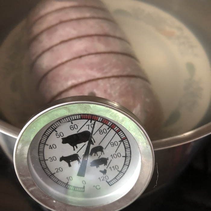 Через 2,5 часа термометр воткнул в середину батончика, температура была 72 градуса, выдержал ещё около часа и отправил остужать, сперва под холодную воду, а потом на пару часов в морозилку.