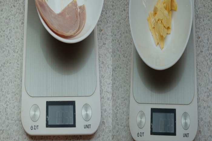 Взвесим основные ингредиенты. Ветчина 39 грамм. Сыр 23 грамма.