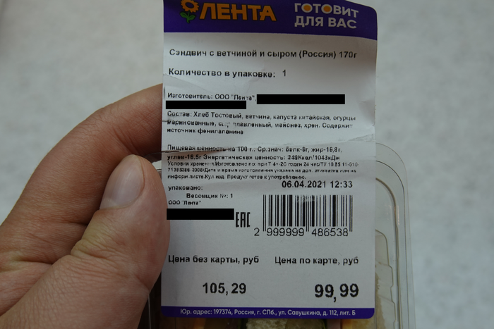 Доброго времени суток, тут я продолжаю разбирать сэндвичи от Ленты на составные части.