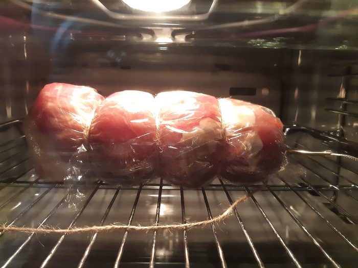 И завернул в рукав, обвязал веревочкой, воткнул щуп термометра и в духовку. Термометр поставил на 72 градуса (с небольшим запасом, надо 70).
