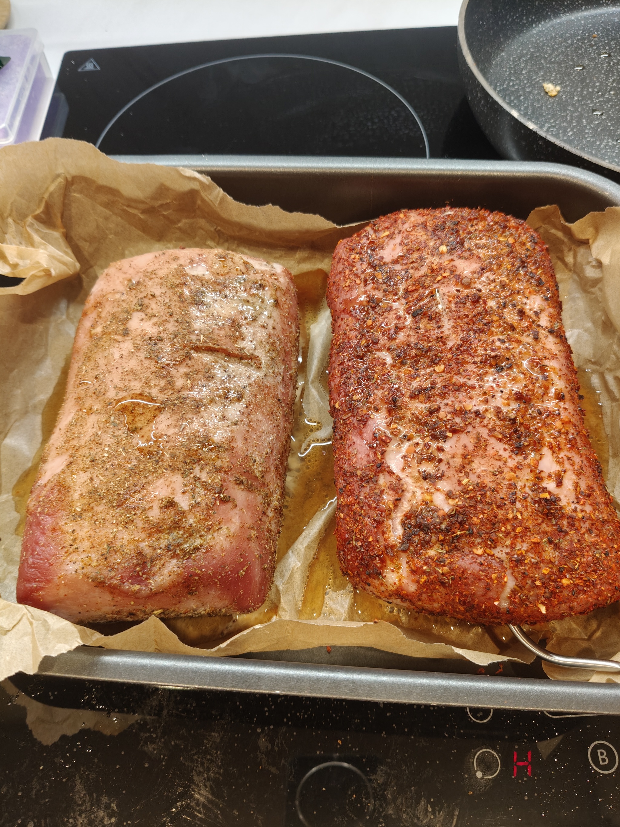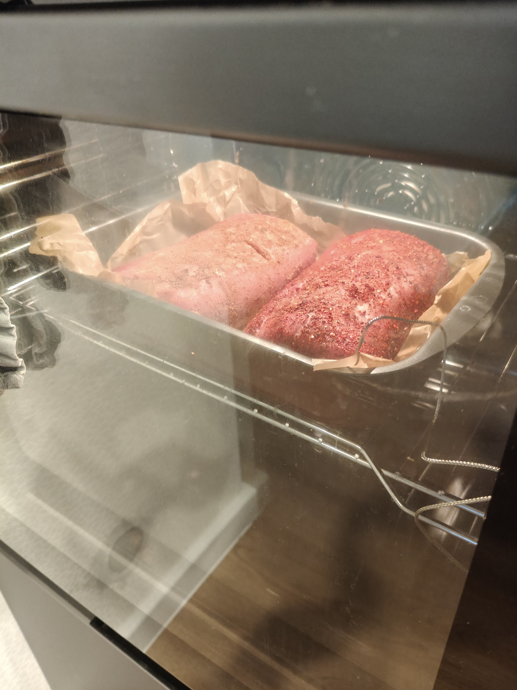 По прошествии недели, вынимаем из плёнки или пакета, не промываем, не замачиваем ничего не делаем. Натираем любимыми специями со всех сторон. Даём постоять при комнатной температуре, примерно час полтора. Вставляем термометр в толщу куска ( в зависимости от вашего термометр - втыкаем в торец или прям сверху в центр.