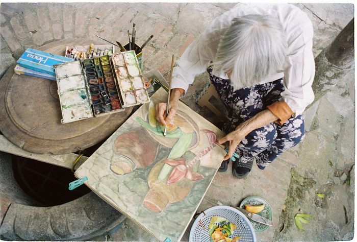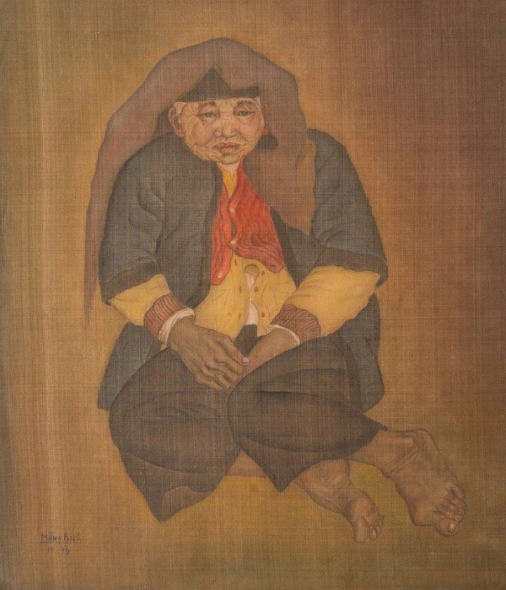Многие работы художницы Монг Бик, возраст которой ныне около ста лет, изображают пожилых женщин или детей, морщинистые лица стариков свидетельствуют о тяжелых и насыщенных событиями днях жизни, а лица детей полны юной энергии и радости. Она пишет по слегка грунтованному шелку или создает тонкие акварели на рисовой бумаге. В каждой ее работе хорошо проступает фактура материала, и она не пытается ее скрывать, а делает - средство художественной выразительности.