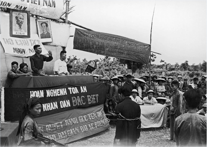 Вьетнамская экспроприация земли. Самое примечательное тут конечно же портрет Мао. А всё потому что та самая вьетнамская земельная реформа была разработана при участии китайских чиновников. Эти же чиновники обучали вьетнамских чиновников, которых в ДРВ не хватало.