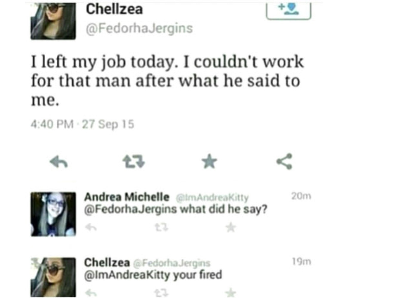 49 TheDale5 Везде шутки 8 лет назад Chezzea- Я сегодня ушла с работы. Я не могла работать на этого человека, после чего он мне сказал.Andrea Michelle- Что же он тебе сказал?Chezea- Ты уволена. X (Twitter) Работа 9GAG