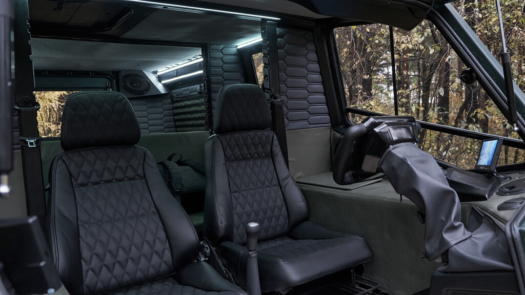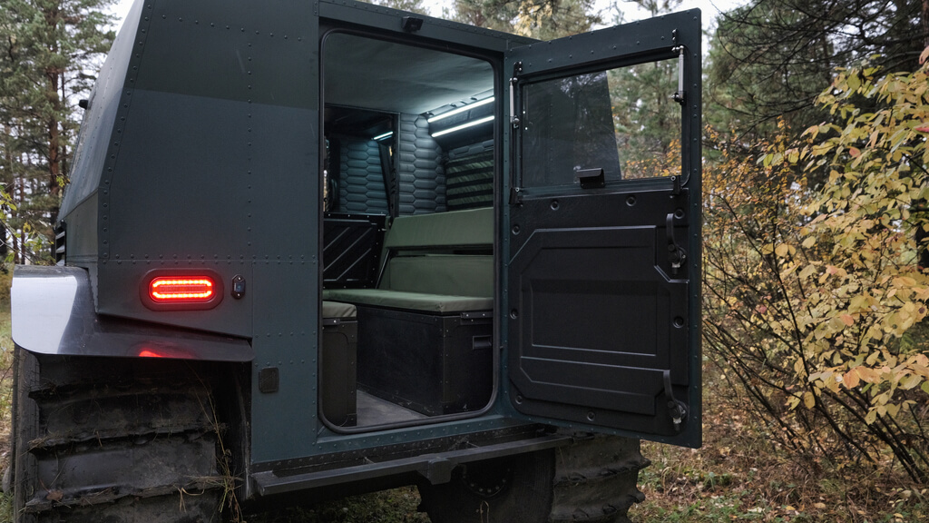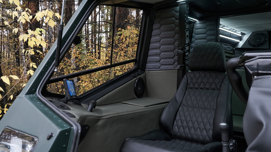 Высокая мобильность и автономность. Комфортная пассажировместимость до 10 человек и 2 полноценных спальных места. Колесный вездеход идеален для длительных поездок с друзьями на природу. Вы можете путешествовать, не привязываясь к дорогам, а выбирать лишь направления. Несмотря на свои небольшие размеры, салон вместителен.