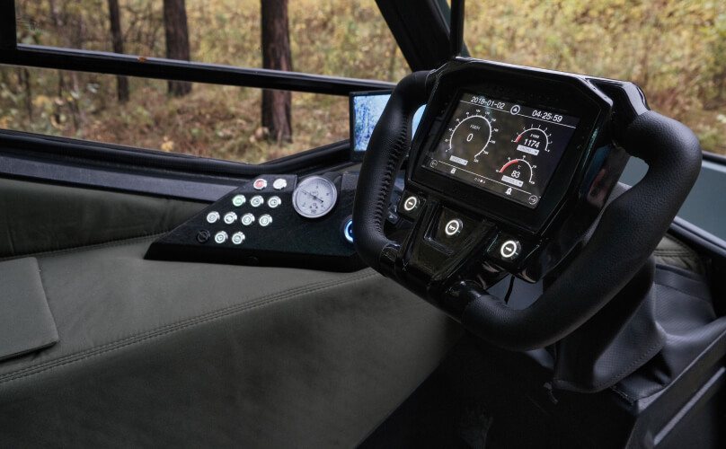 Штурвал для управления вездеходом со встроенным бортовым компьютером, на который выводится вся необходимая информация по состоянию машины.