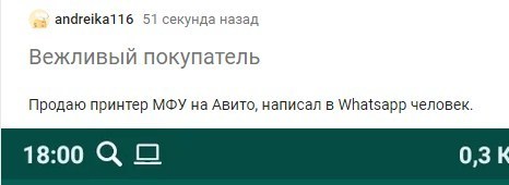 После 2-ух его сообщений стало понятно – ясен красен мошенник. Поэтому я вежливо предложил ему общаться на Авито. За что был послан далеко и надолго. Принтер мой, скрины мои, тэг "Моё"