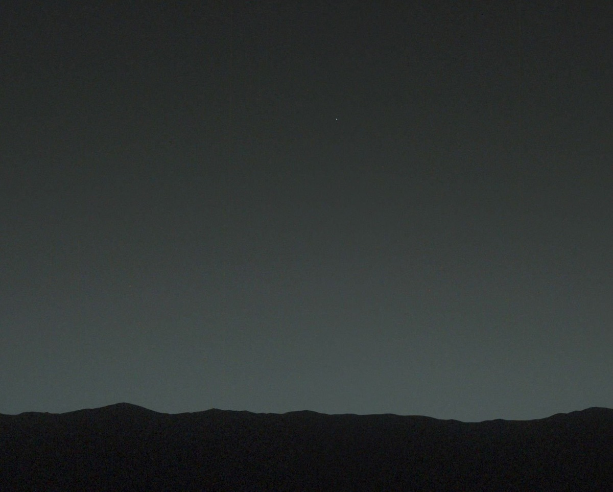 Это фотография сумеречного неба с Марса, сделанная марсоходом NASA "Кьюриосити". На ней видно Землю в виде яркой точке света. Она просматривается в верхней части снимка. Примерно так же выглядит Марс с Земли, если на него смотреть невооруженным глазом. Марсоход сфотографировал участок неба, на котором в тот момент была видна только одна Земля.