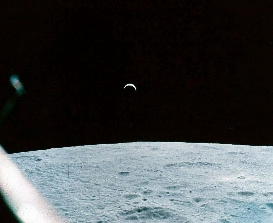 А это фото земного серпа над лунной поверхностью, сделанное уже экипажем корабля Аполлона-15, который стартовал к Луне 26 июля 1971 года. Можно обратить внимание, что в объектив камеры попали солнечные лучи. Они просматриваются в виде бликов и белых помутнений.