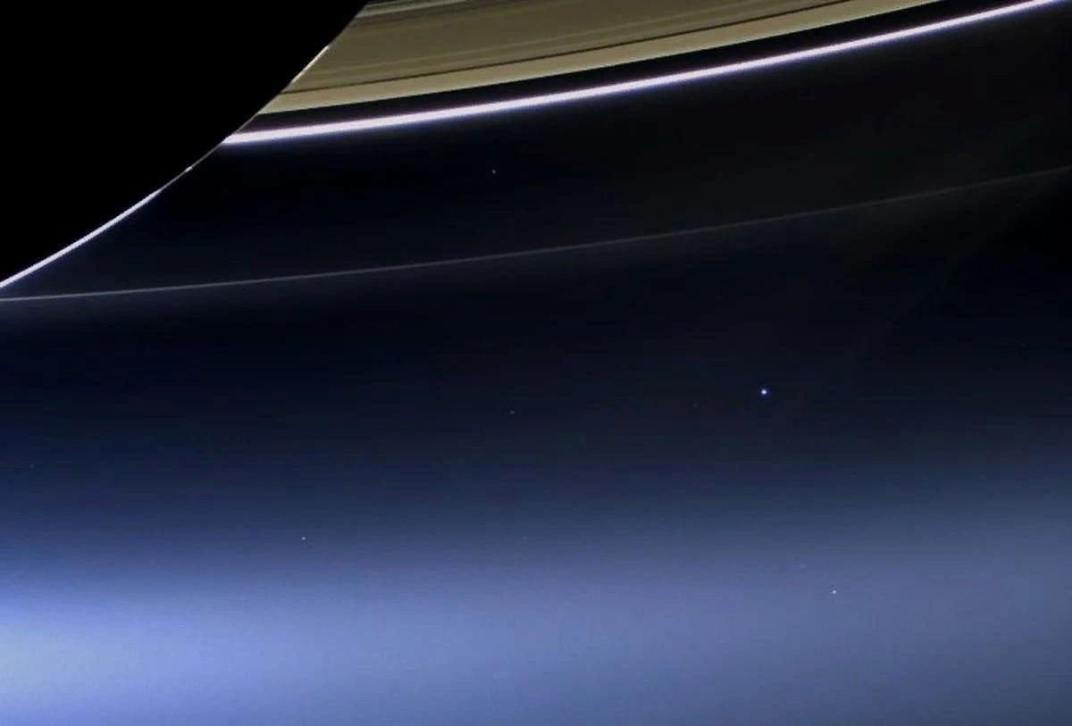 На орбите Сатурна, изучая его кольца, космическая станция "Кассини" делала фотоснимки Сатурна, его колец и всего окружающего пространства вокруг. В кадре можно обнаружить нашу планету. На фотоснимке Земля выглядит маленькой яркой синей точкой, выделяющейся среди всех остальных звезд, попавших в кадр.