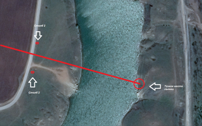Вот, выделил точное место съемки и линией обозначил примерное направление взгляда на место выстрела с поправкой на ветер с севера. Чуть позже выложу более менее правильное направление взгляда уже с выходом на территорию Украины. Но то, что стрельба велась скорее всего Украинцами или как минимум с территории близкой к границе - это факт.