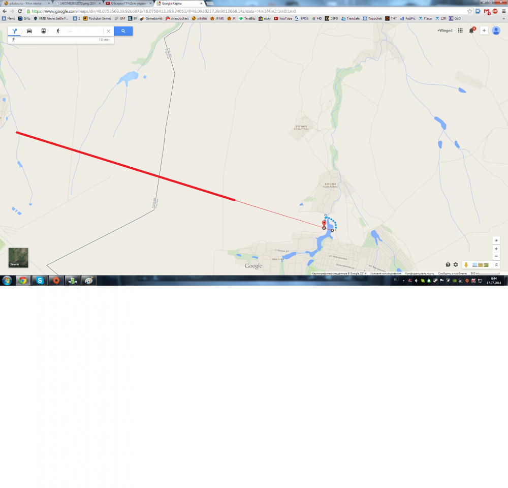 Вот, выделил точное место съемки и линией обозначил примерное направление взгляда на место выстрела с поправкой на ветер с севера. Чуть позже выложу более менее правильное направление взгляда уже с выходом на территорию Украины. Но то, что стрельба велась скорее всего Украинцами или как минимум с территории близкой к границе - это факт.