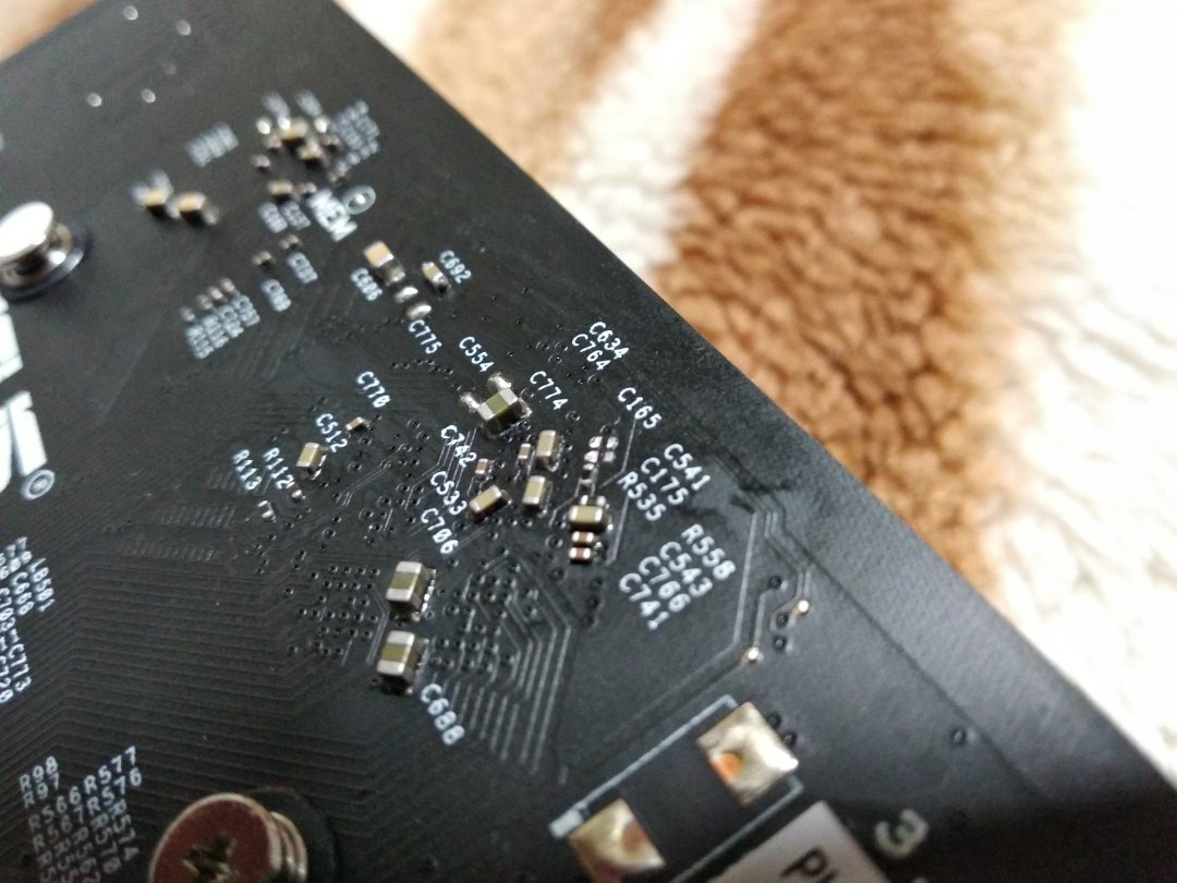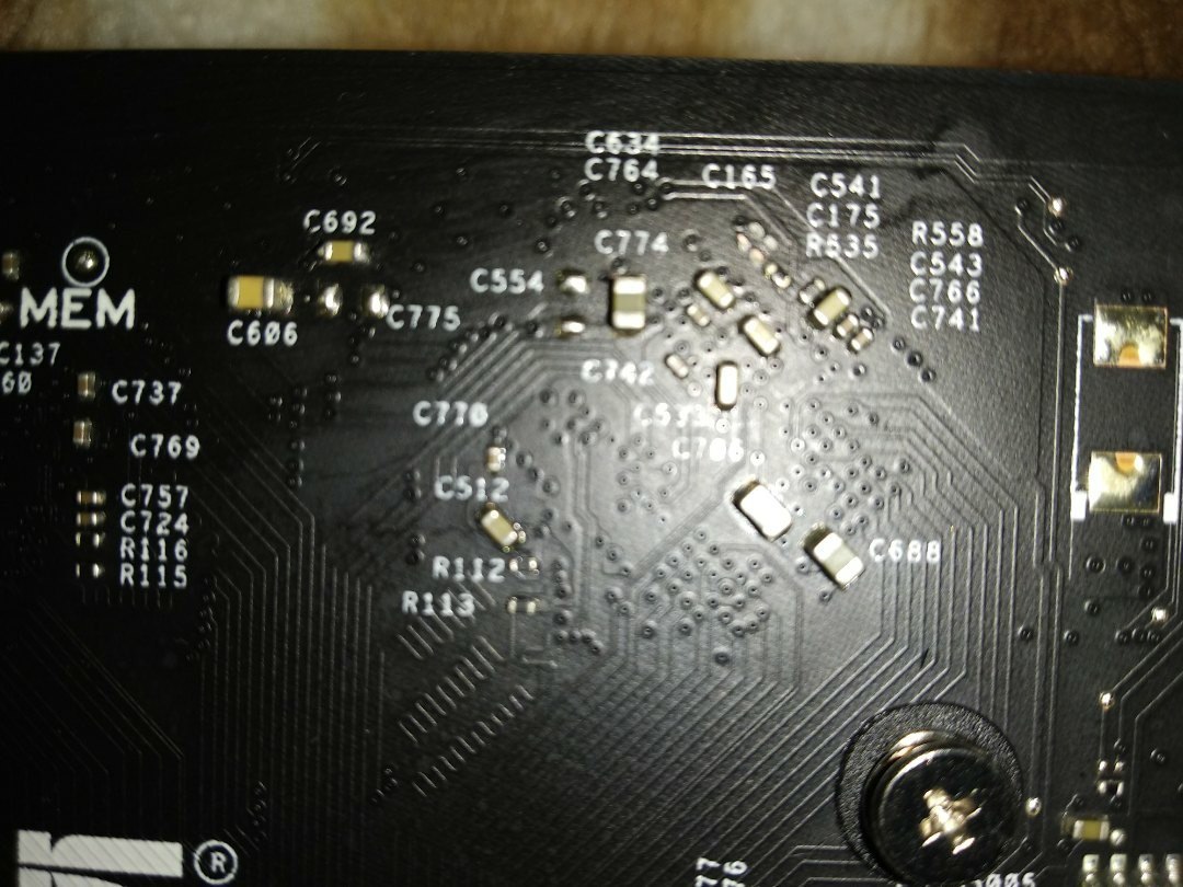 Короче, решил вернуть обратно или поменять на другую (но в наличии других не было, дефицит, а на заказ самая низкая цена была от 11 000). В магазине сразу манагер стал что то говорит про технически сложный товар, сложность с возвратом и т.п. Я понес карту в их сервисный центр для осмотра и заключения. Мастер на инфостойке взял карту и практически моментально сказал: у вас отломан транзистор в цепи питания (не совсем отломан, а отогнут) (на фото - С692). Сказал, что это и вызывает подобные артефакты. Но т.к. это механическое повреждение, это уже не гарантийный случай, сами накасячили, гарантия слетает. Я немного охренел ,т.к. доказать и проверить нереально. Это, что получается, я как покупатель должен знать всю распайку на карте и проверять ее при покупке с лупой. Эта деталь настолько мала, что не всякий сможет разглядеть. а тем более понять, отломлена она или вообще должна ли тут быть. Вообщем выбора у вас нет, мы только может взять на ремонт. Вышел второй мастер, который краем уха слышал эту ситуацию, взял карту, осмотрел и вынес такой же вердикт, но добавил, что может припаять кондер (без возмездно). Я согласился...к тому же, он уверял, что после этого все заработает как надо. Я немного успокоился. Приехал домой... и все повторилось, как в первый раз, те же артефакты, та же частота на ядре.