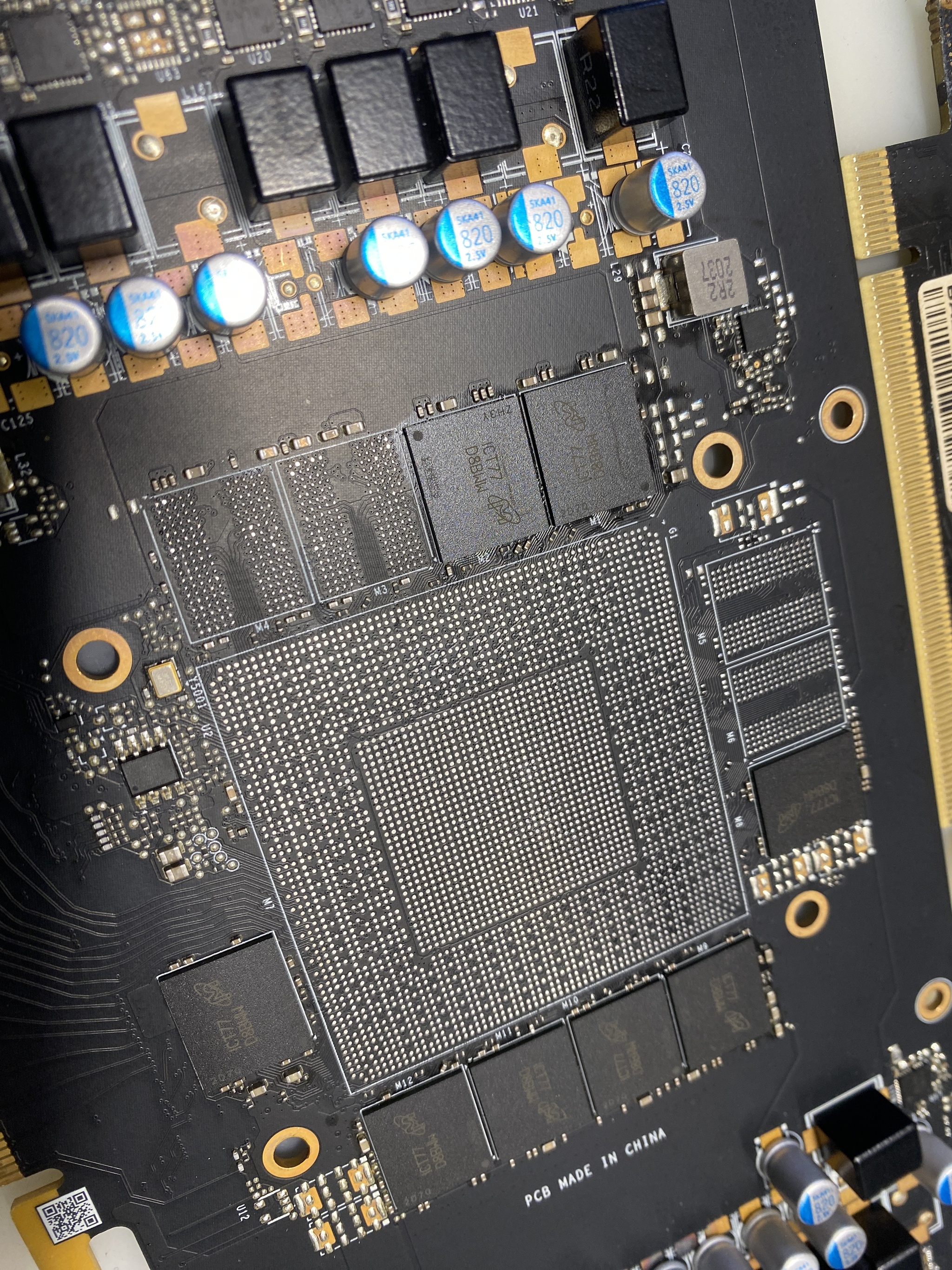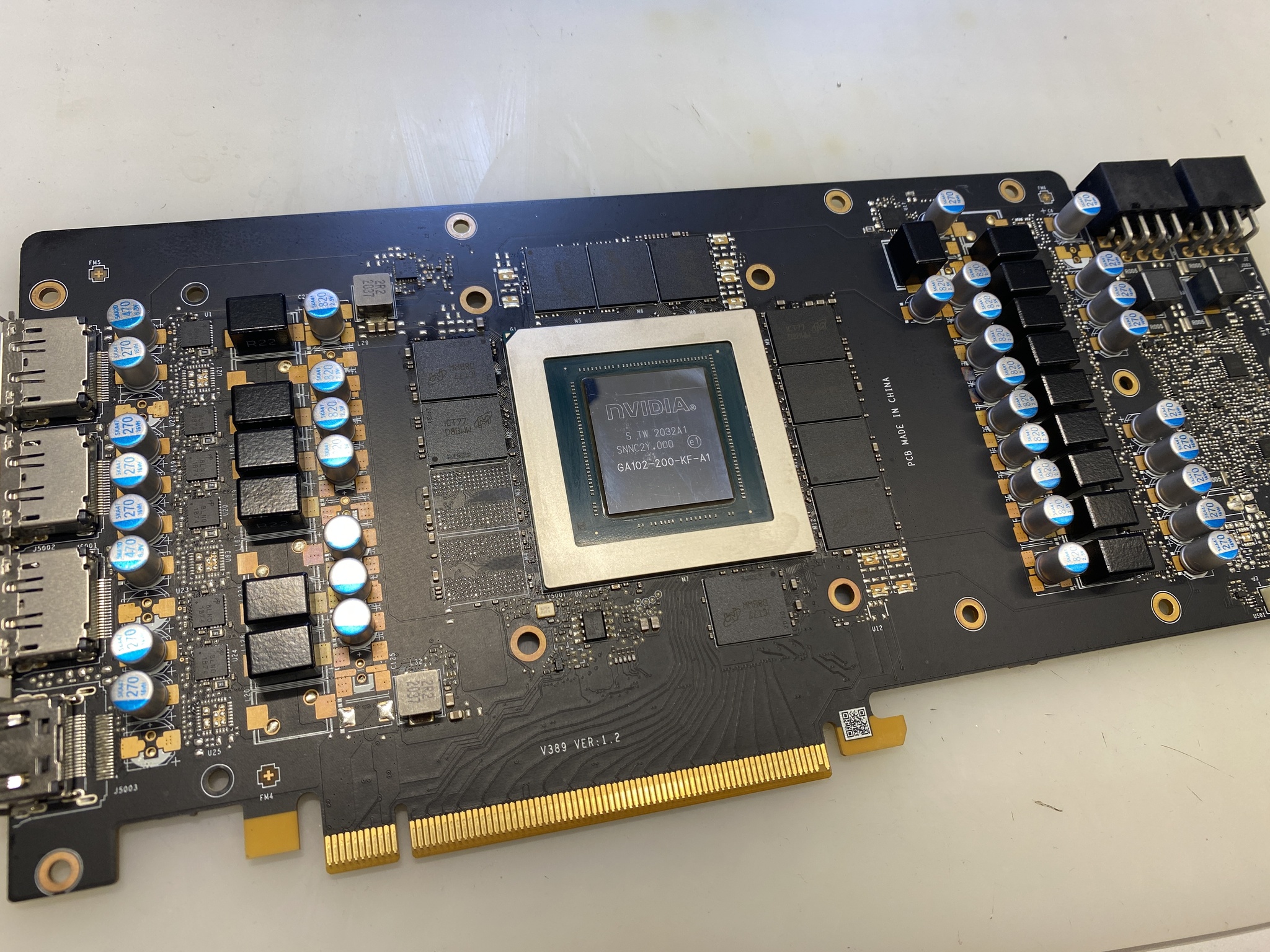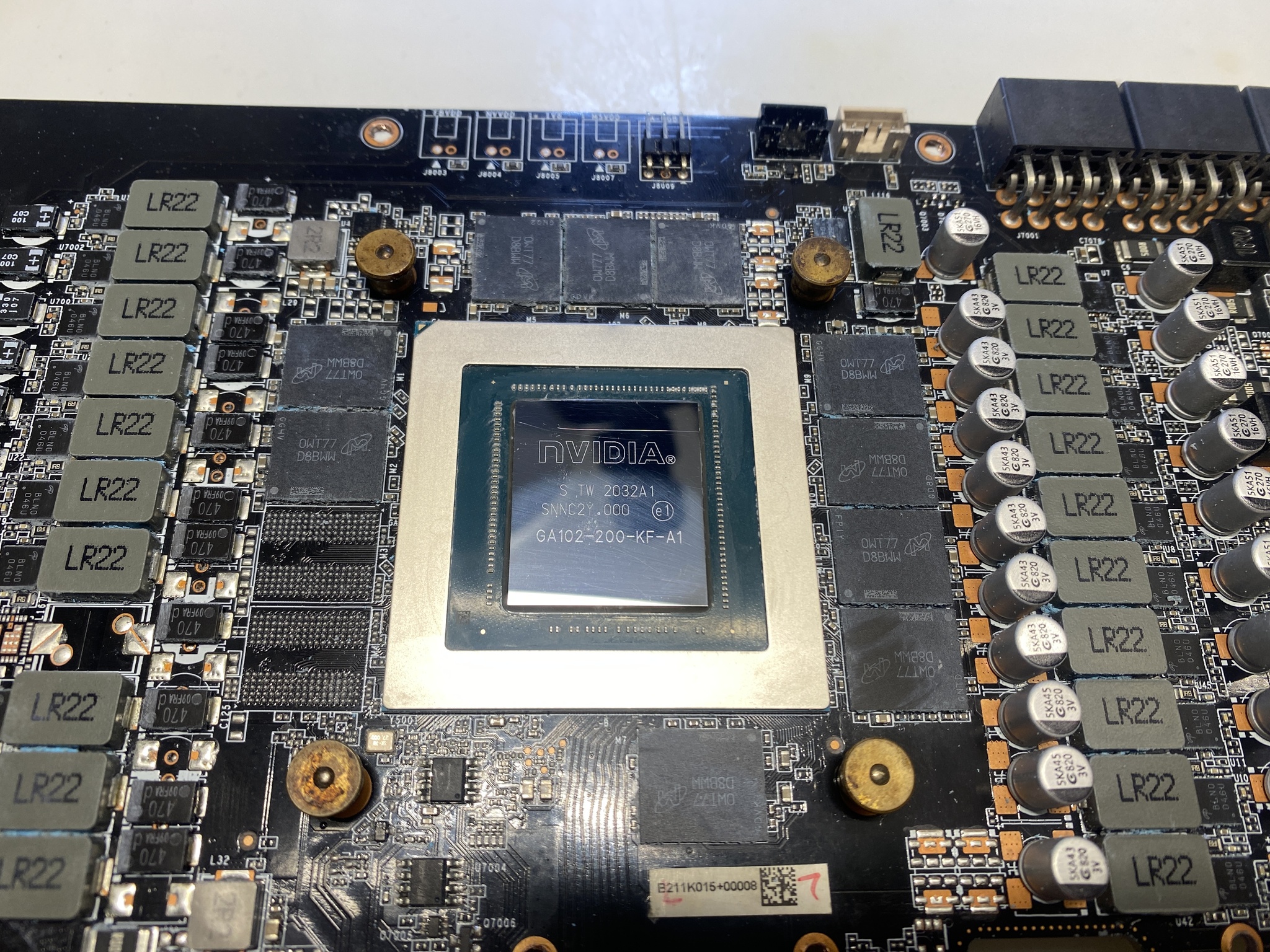Снимаем чипы со старой платы, чтобы пересадить на новую. Но и тут не всё так легко - на данной плате стоит достаточно редкий чип GA102-200-KF-A1, тогда как на большинстве других 3080 стоит GA102-200-KD-A1 либо же GA102-202-KD-A1. Это "обрезок" от 3080ти (GA102-225-A1), которого лишили 2 ГБ памяти. Для KD варианта - у него отсутствуют 2 чипа памяти сверху, в канале D, для KF, соответственно , в канале F (последние 2 чипа памяти).