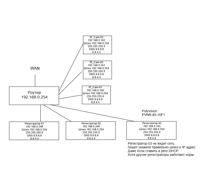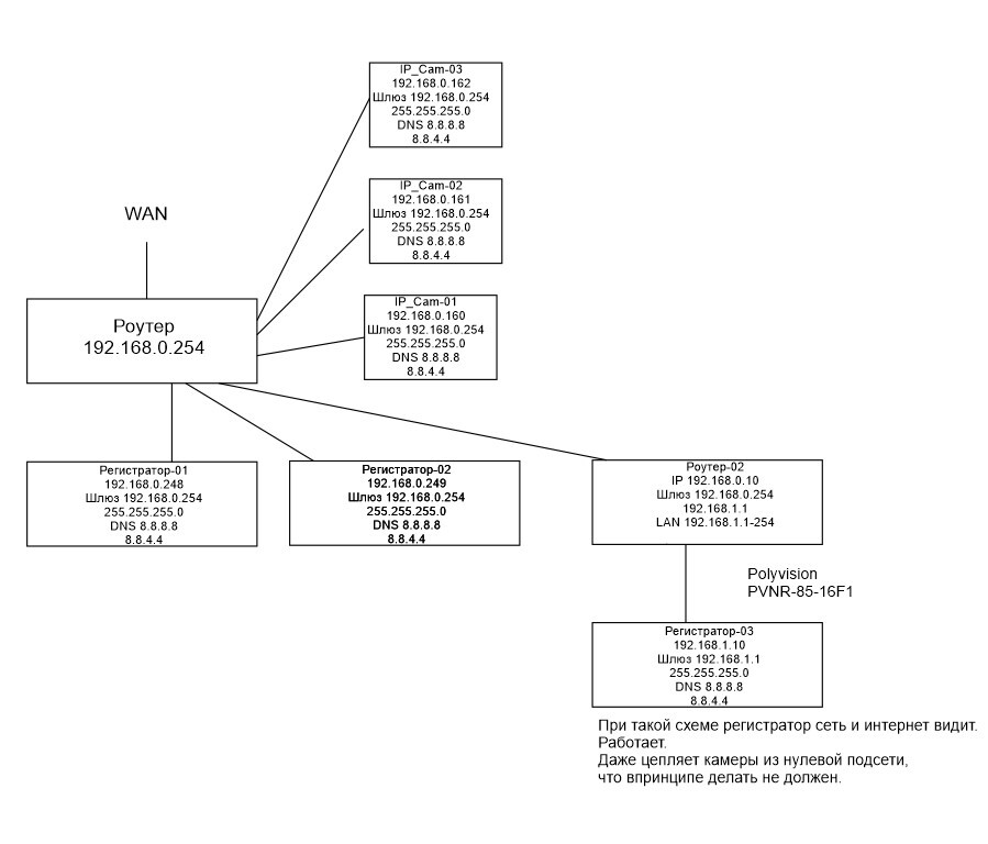 на работе 3 рега и два десятка камер. все Polyvision. Основной роутер с IP 192.168.0.254. Так сложилось. Все камеры и реги в одной подсети 192.168.0.XXX.
