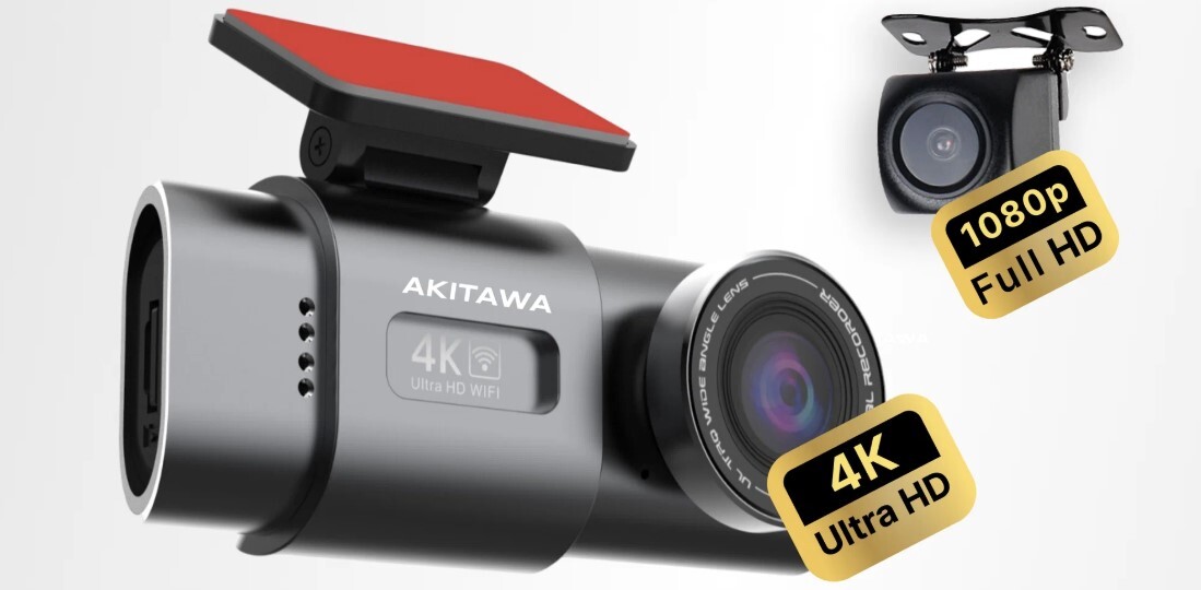 Интересная модель от бренда AKITAWA. Отмечу электронную стабилизацию изображения, которая позволяет регистратору получить плавную картинку даже при езде по неровной дороге. Базы GPS обновляются, предусмотрено подключение по WiFi. Матрица SONY IMX 307 пишет в формате 4К 3840х2160. В комплекте поставляется и задняя камера, которая снимает в FullHD 1080р.