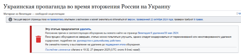 Что же с другой стороны? Смотрим списки недавних военных фильмов Незалежной, и, о чудо, там нет слова "пропагандистский"! При этом в вики существует такая статья, как "Украинская пропаганда во время вторжения России на Украину". Вот только она выставлена на удаление ещё с 30 мая 2024 года (кого-то коробит видимо). При этом слова "русофобия" в статье нет совсем!