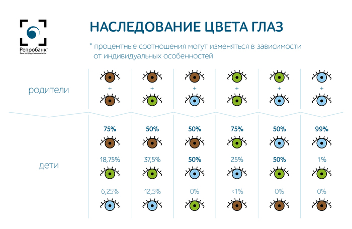 Ответ: Да. Цвет глаз зависит от количества и распределения пигмента меланина в радужной оболочке. На этот процесс влияют несколько генов. Ниже вероятность, с которой обычно наследуется этот признак.